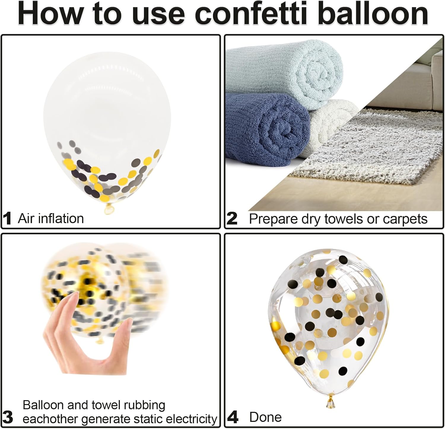 • 【How to Make Black Gold Confetti Balloon】- These black gold confetti latex balloons can inflate hydrogen, helium ( it will float for more than 12 hours), and air.The best way to rub the surface of the balloons is with a dry towel or hair and silk. And it is recommended to use a pump to quickly inflate so that confetti is easier to be stuck.