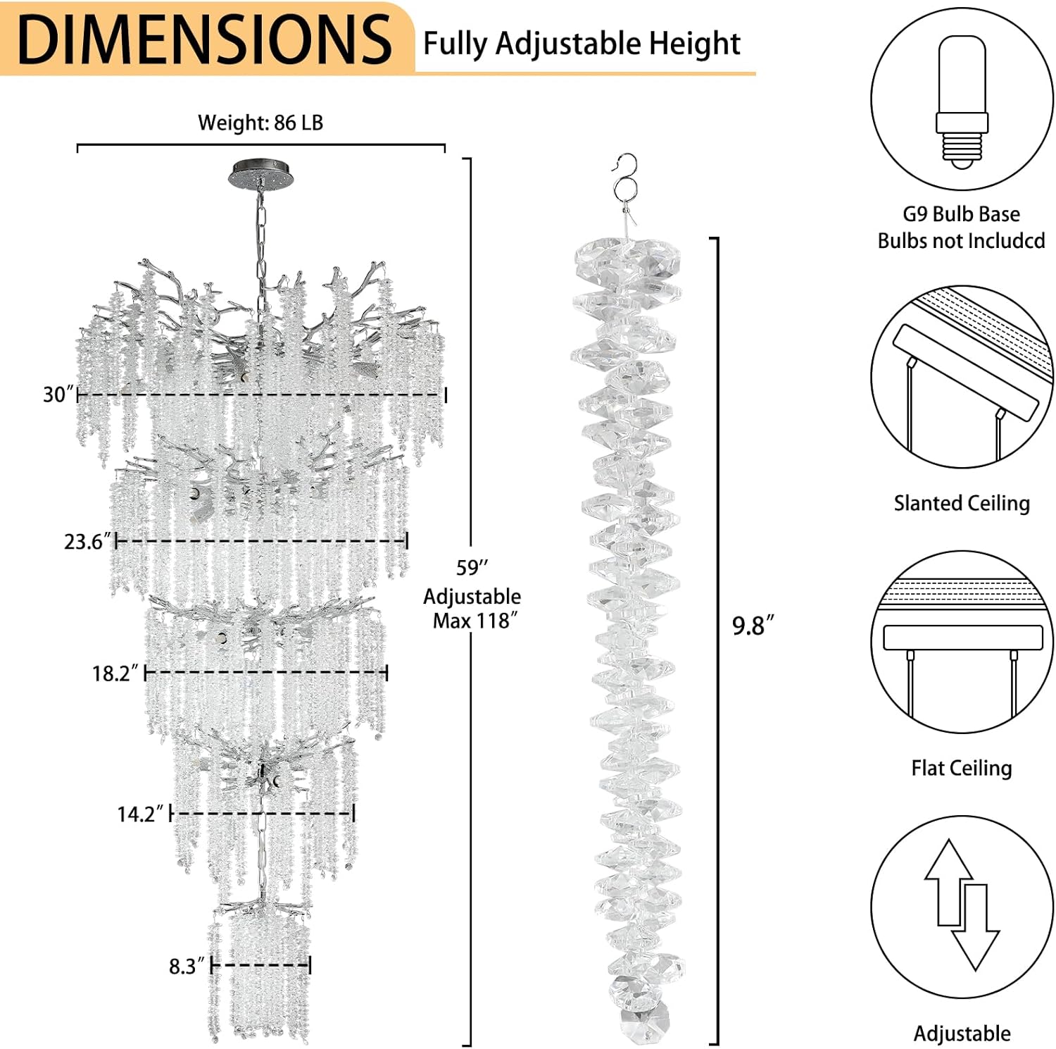 • 【Applicable Places】The crystal high-ceiling chandeliers is like a shining silver tree, capable of illuminating and warming your entire house. It is compatible with both flat and sloped ceilings, making it the perfect choice for lighting indoor areas such as the foyer, living room, dining room, hallway, or home bar