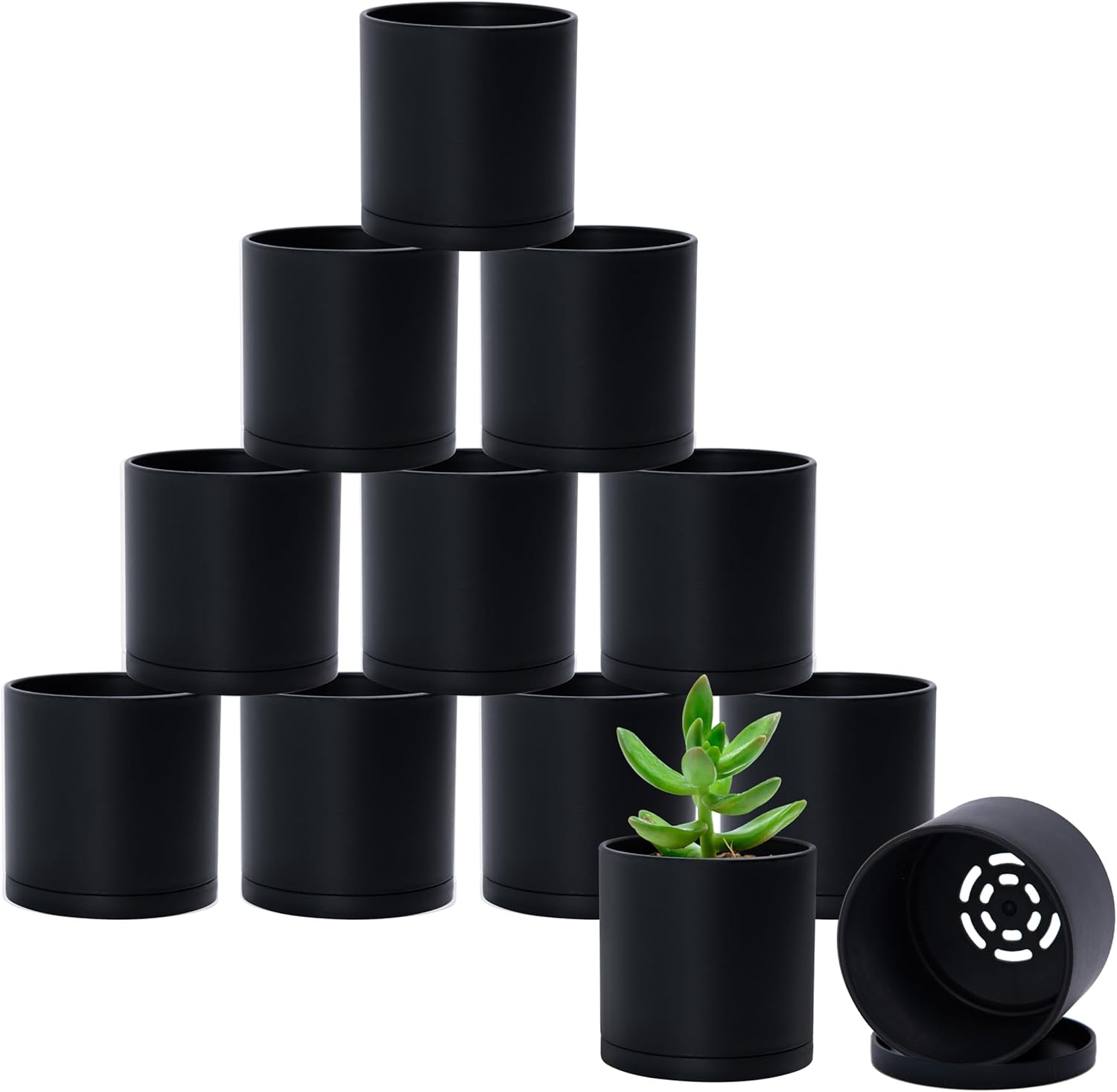 • What's Included: Set of 12 black plastic pots with saucers, 3.5" in Opening Diameter, 3" in Height.