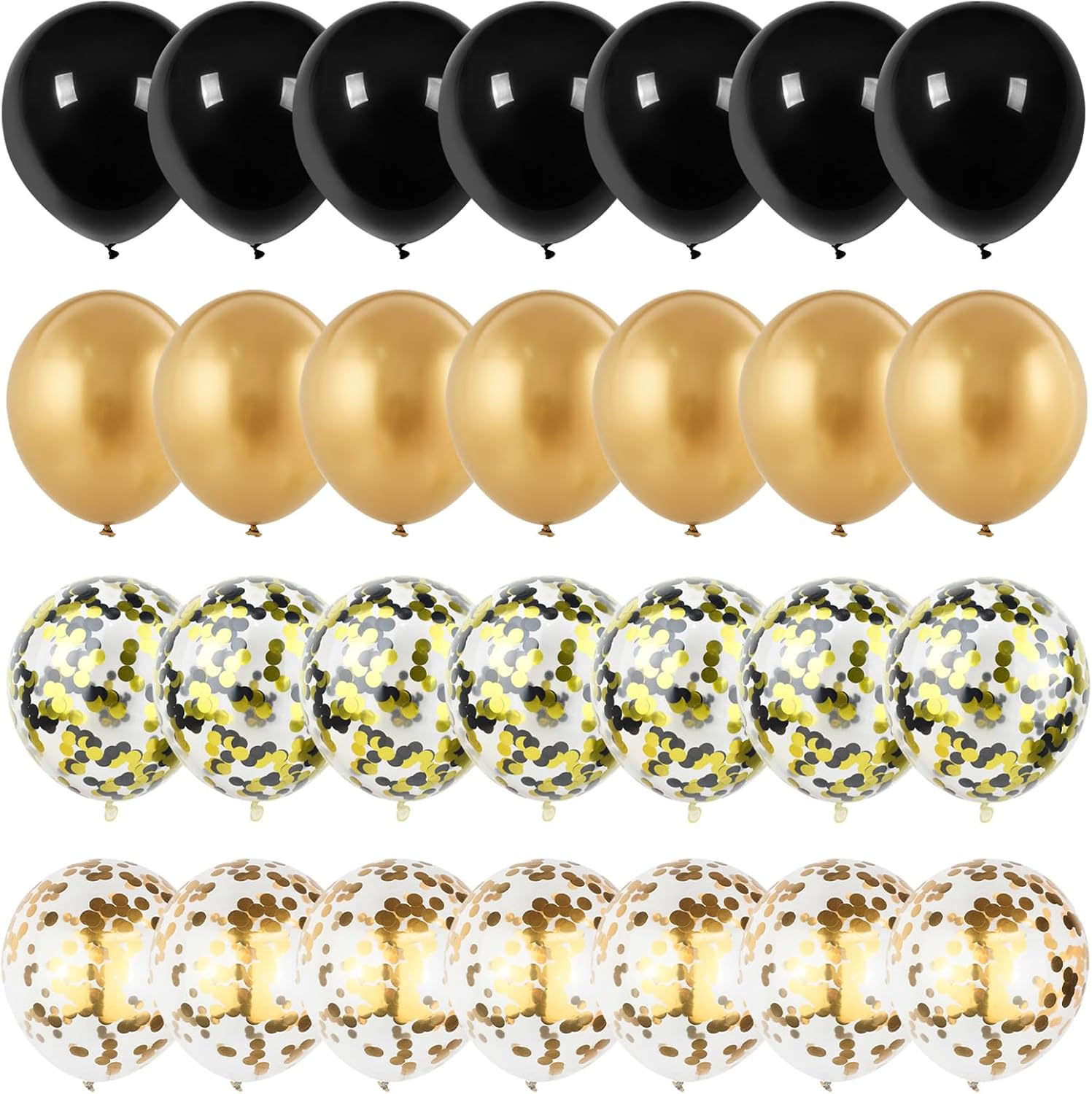 • πŸŽ‰ Black Gold Balloons - You will get 35 pieces 12 inch latex party balloons set, includes matte black 15pcs, metallic gold 12pcs, gold confetti 4pcs, black gold confetti 4pcs, come with 1pc gold balloon ribbon. Perfect for women men birthday baby bridal shower wedding new year party decorations supplies.