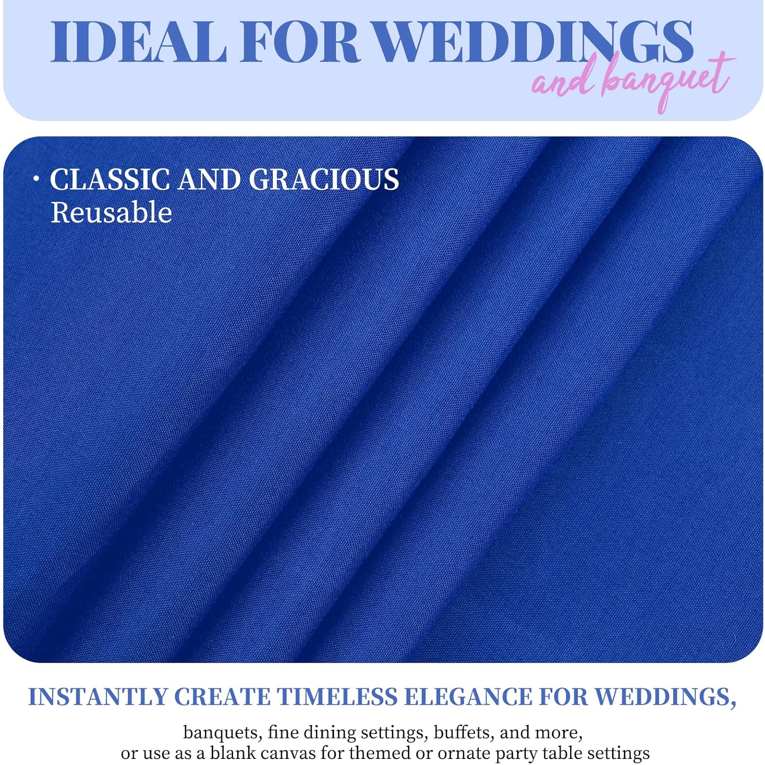 • 【Size】This Royal Blue table cloth is 90 x 132 Inch, for standard 8ft table, providing 18 inch drop. Royal Blue table cover is more luxurious, classic and gracious, for both formal & casual settings and makes a great for all occasions.