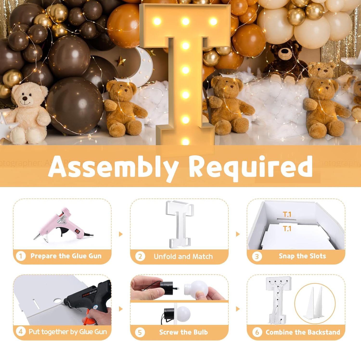 • Assembly Needed: Each marquee letter are pre-cut frame with slots, 1) Match the slots on the board and put all boards together by hot glue. 2) Screw the bulbs on the board and install 3 AA batteries. (Noted: Glue gun and batteries are not included)