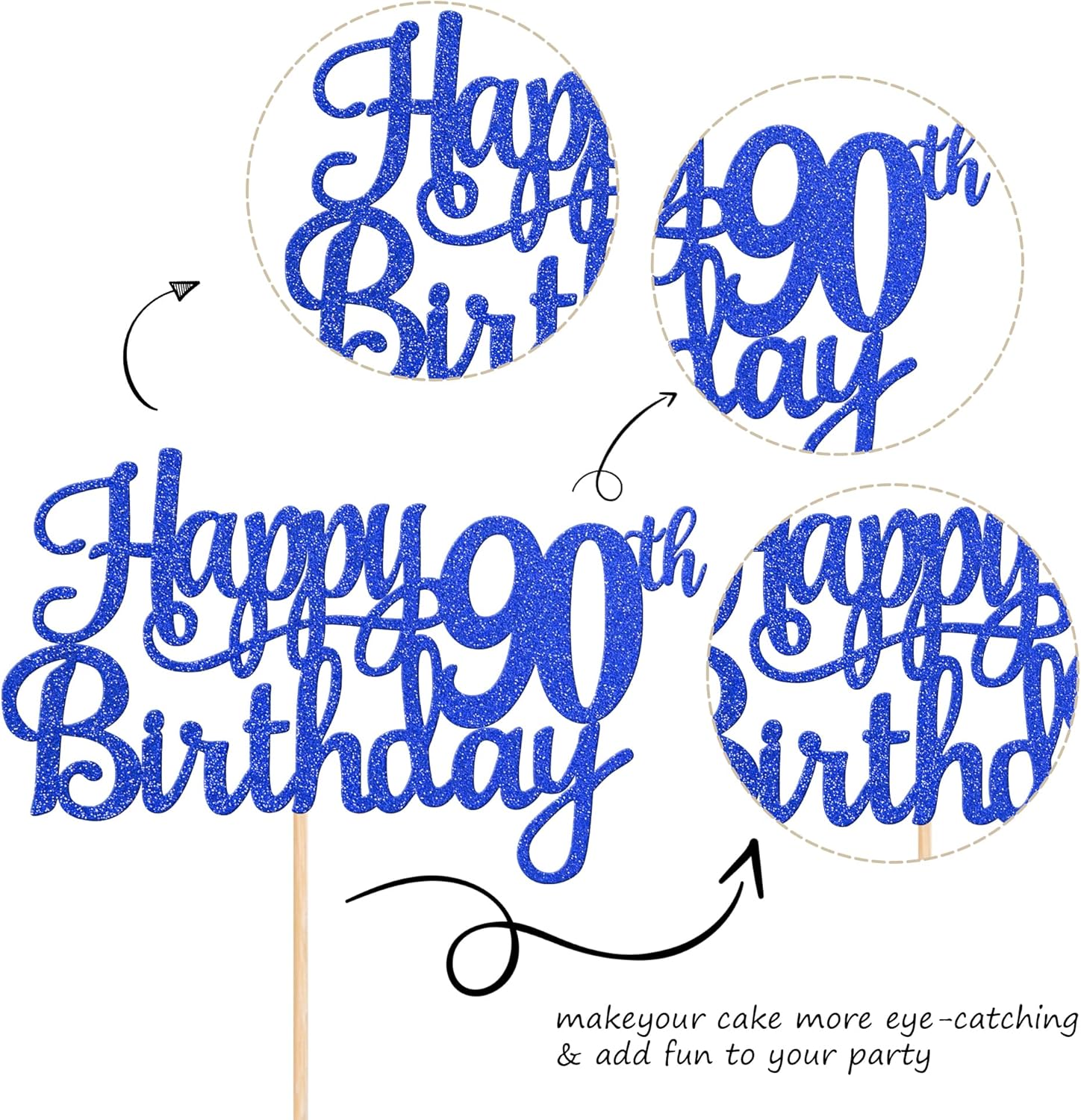 1 PCS Happy 90th Birthday Cake Topper Glitter Cheers to 90 Years Birthday Cake Pick Ninety 90 Fabulous Cake Decoration for Happy 90th Birthday Theme Party Decorations Supplies Blue