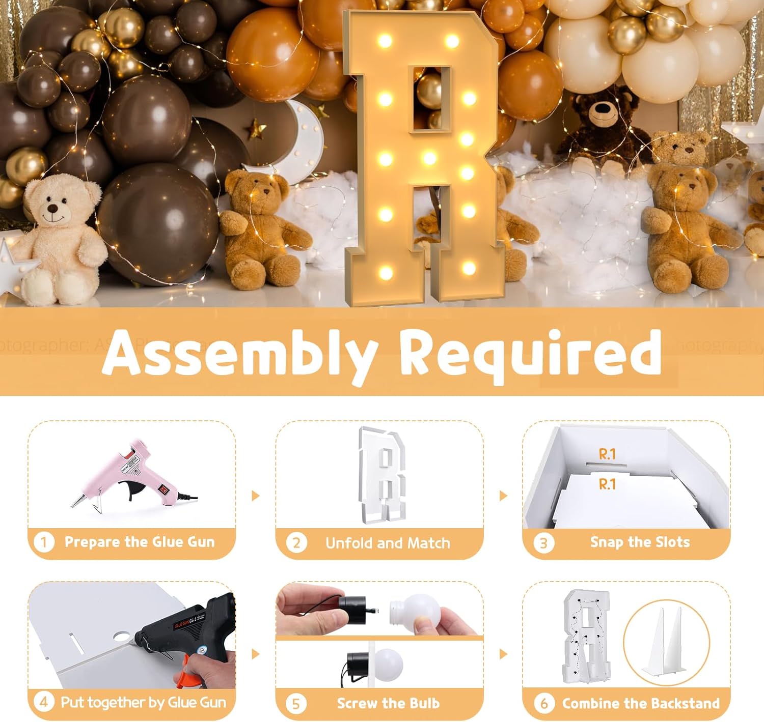 • Assembly Needed: Each marquee letter are pre-cut frame with slots, 1) Match the slots on the board and put all boards together by hot glue. 2) Screw the bulbs on the board and install 3 AA batteries. (Noted: Glue gun and batteries are not included)