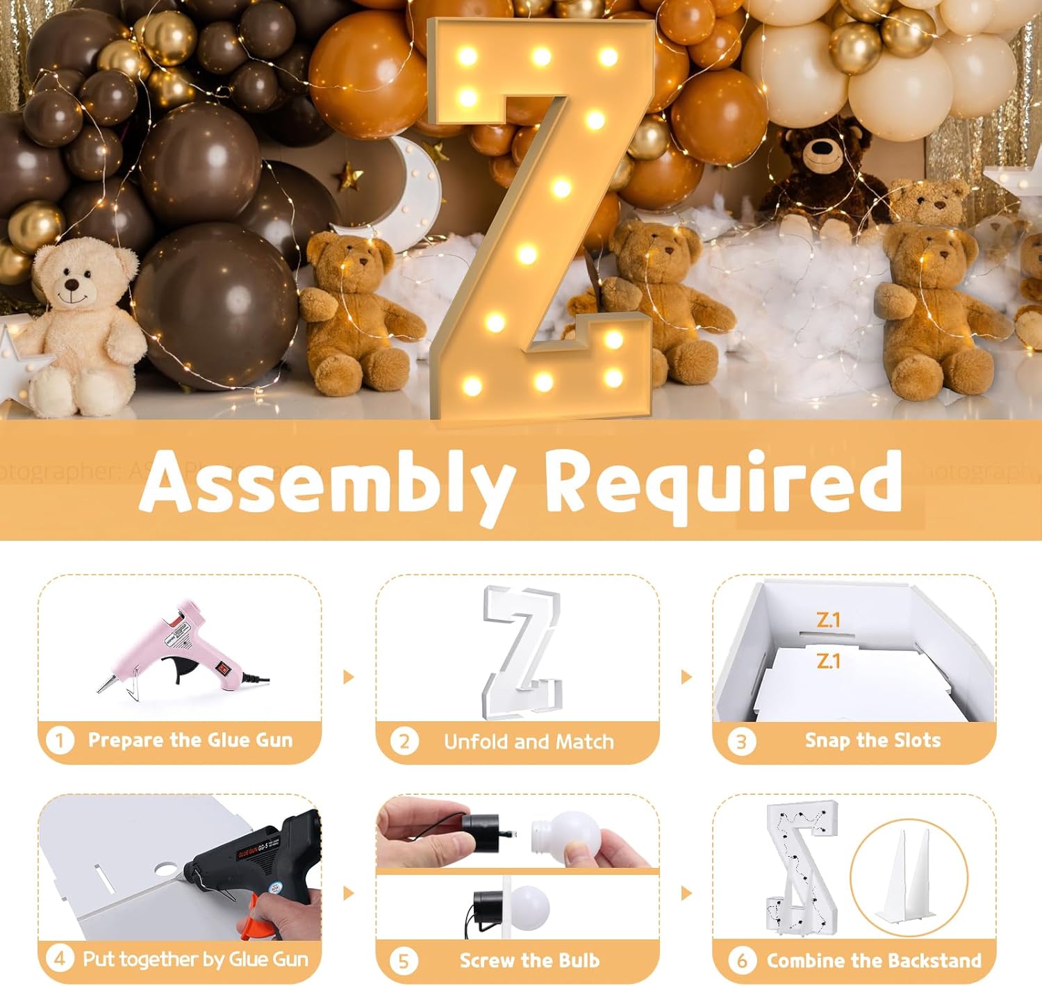 • Assembly Needed: Each marquee letter are pre-cut frame with slots, 1) Match the slots on the board and put all boards together by hot glue. 2) Screw the bulbs on the board and install 3 AA batteries. (Noted: Glue gun and batteries are not included)