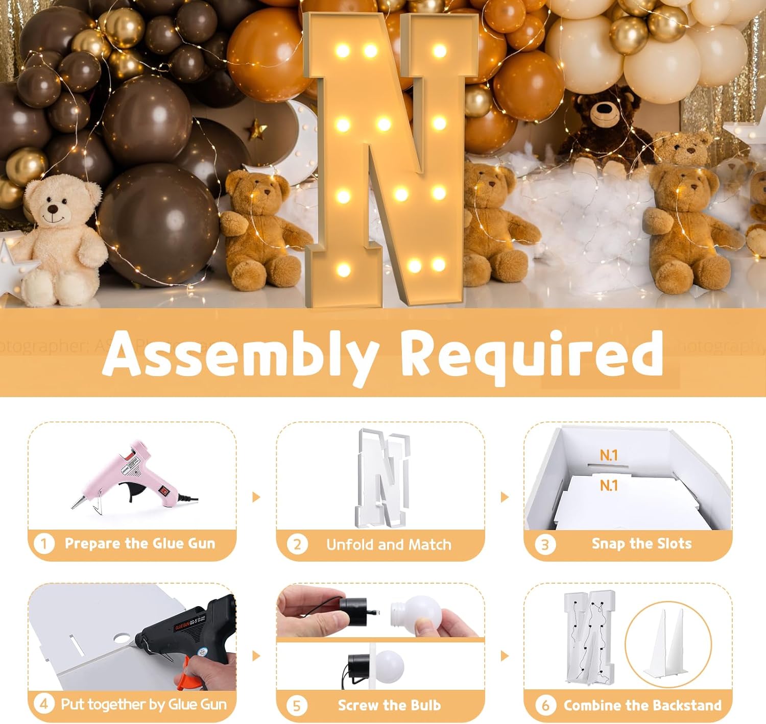 • Assembly Needed: Each marquee letter are pre-cut frame with slots, 1) Match the slots on the board and put all boards together by hot glue. 2) Screw the bulbs on the board and install 3 AA batteries. (Noted: Glue gun and batteries are not included)