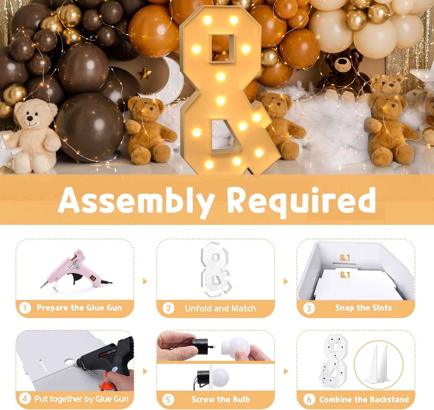 • Assembly Needed: Each marquee letter are pre-cut frame with slots, 1) Match the slots on the board and put all boards together by hot glue. 2) Screw the bulbs on the board and install 3 AA batteries. (Noted: Glue gun and batteries are not included)