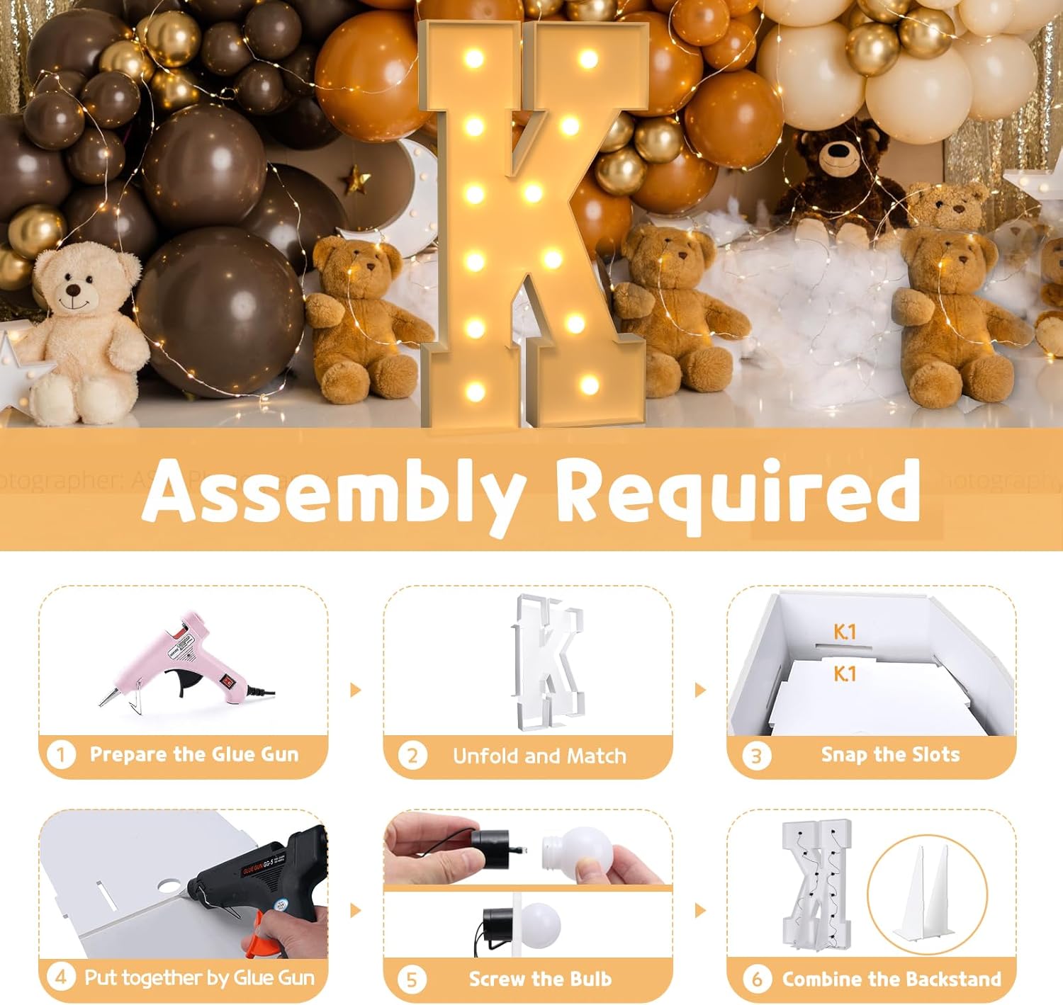 • Assembly Needed: Each marquee letter are pre-cut frame with slots, 1) Match the slots on the board and put all boards together by hot glue. 2) Screw the bulbs on the board and install 3 AA batteries. (Noted: Glue gun and batteries are not included)