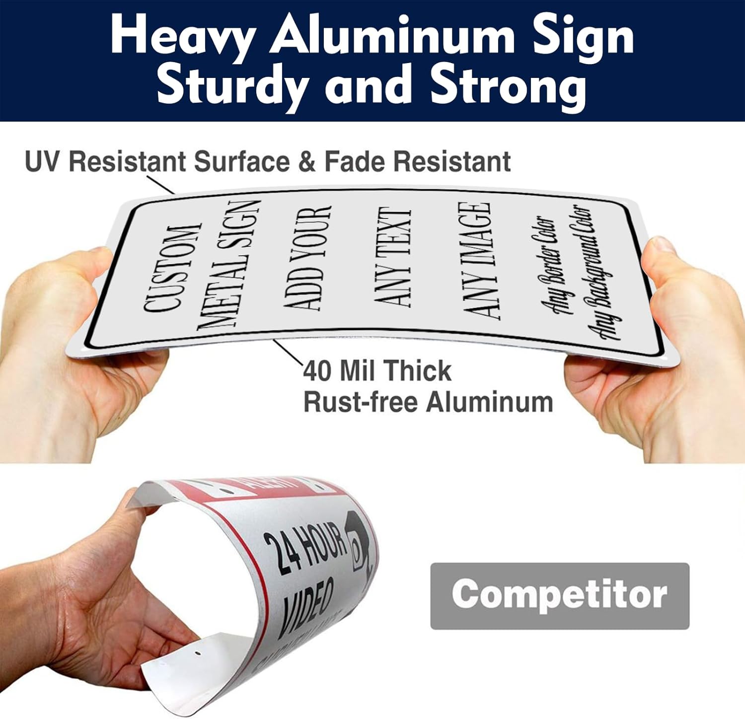 • 12 x 8 inch aluminum custom metal sign with 4 pre-drilled holes on the side that can be easily attached to any surface such as walls, doors or fences with cable ties or screws.