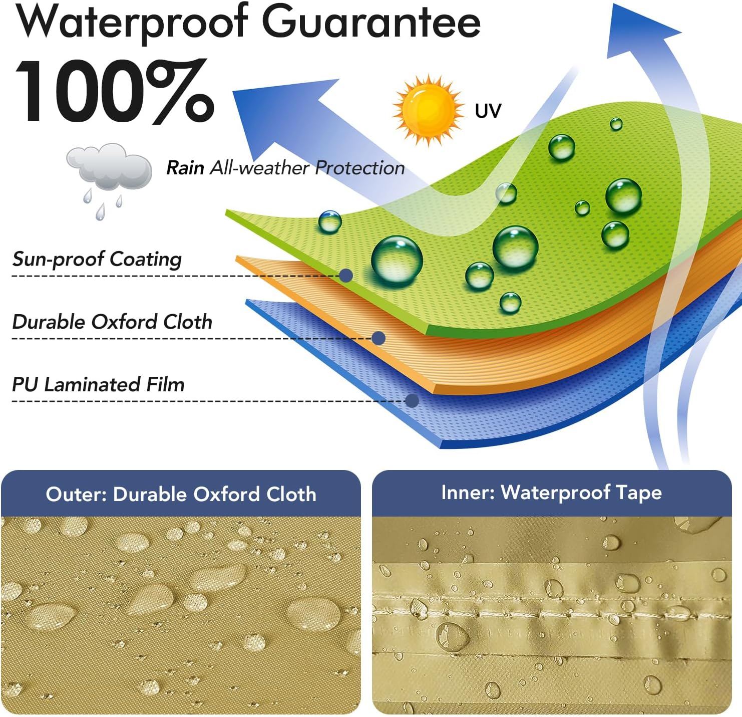 • 100% Waterproof & UV Resistant: Richwon outdoor chair cover is made of durable oxford fabric that added PU coating, which makes the covers UV-resistant and 100% waterproof. Passed particular waterproof test by authoritative third party, No worry to leak anymore. Suitable for all seasons, even in extreme weather such as heavy rain, snow, and hot sun.