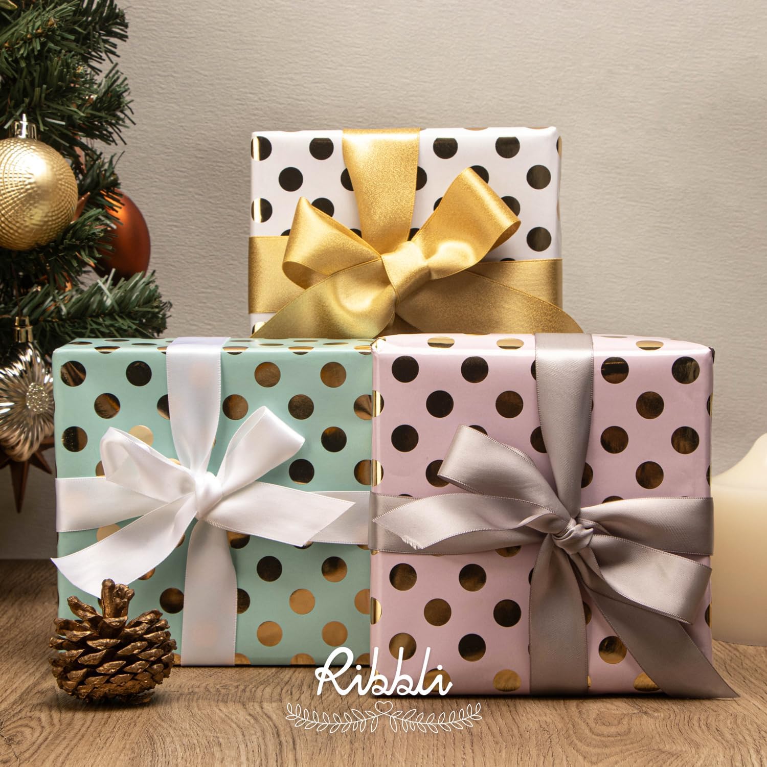 Ribbli Birthday Wrapping Paper Polka Dots Gift Wrap for Baby Shower Roll, 3 Rolls Pink White Blue Dots Pattern with Gold Foil - 17 inch x 120 inch(10feet) Per Roll