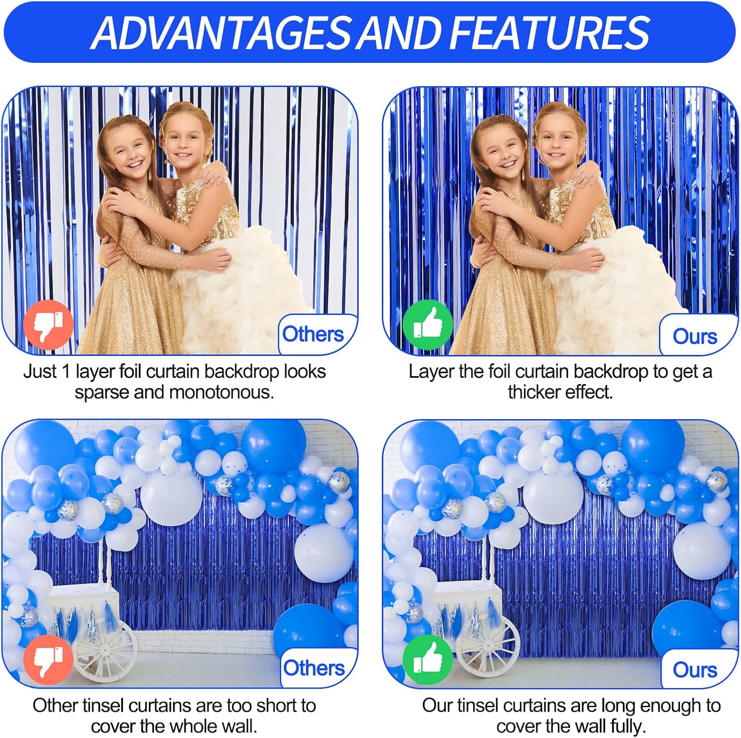• Easy to Use - The foil curtain backdrop comes with double sided tape on the top, peel plastic strip off and it would be very easy to paste on smooth surfaces such as wall, window, table, door or anywhere you like. You can cut the foil curtain with scissors into the suitable Length, assemble the party streamers side by side to make the black backdrop larger, or layer the backdrop curtains to get a thicker effect.