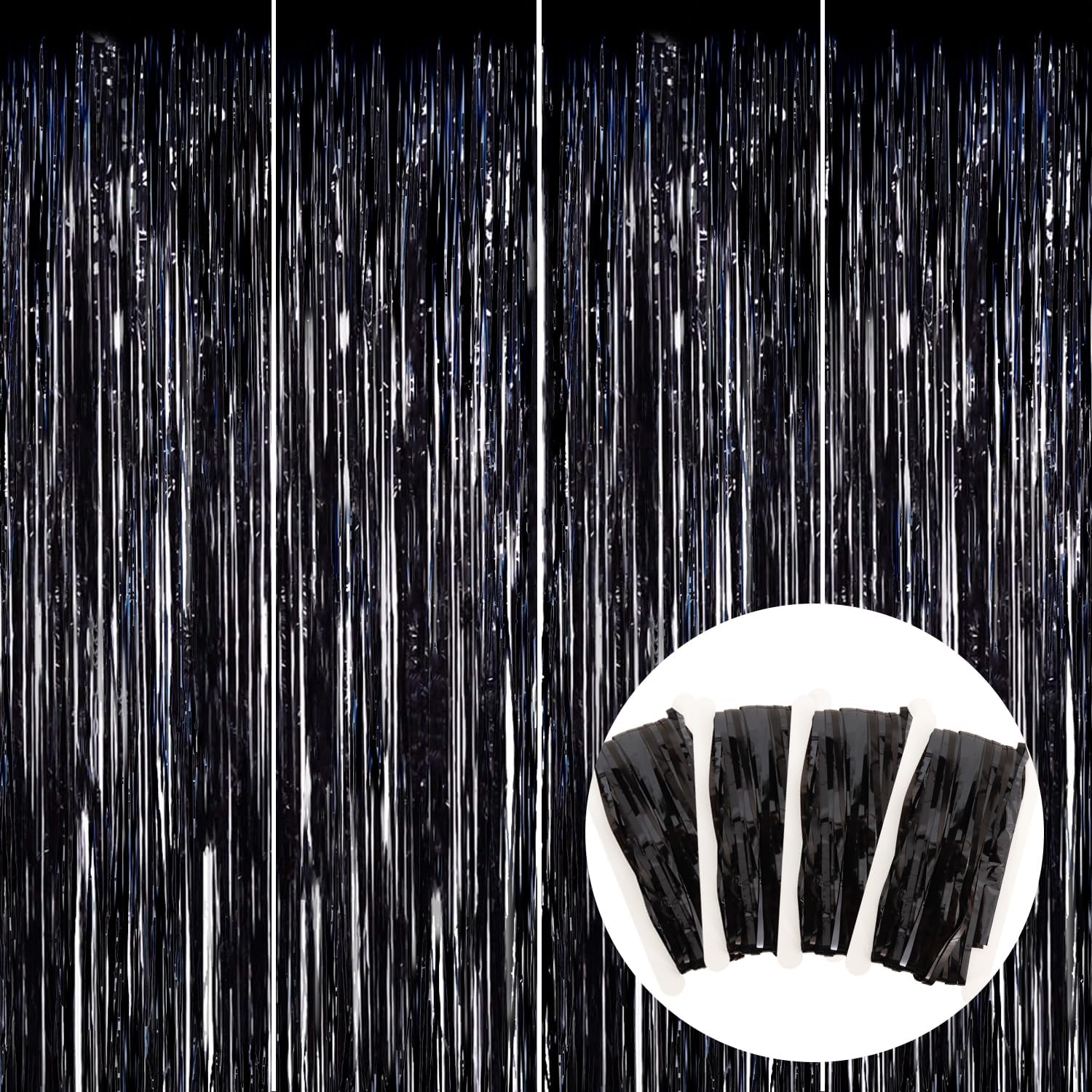 BEISHIDA 4 Pcs Black Door Streamers Tinsel Curtain Party Streamers Backdrop Fringe Foil Wall Background for Birthday Halloween Christmas Wedding Party Decoration(3.28 ft x 6.56 ft)