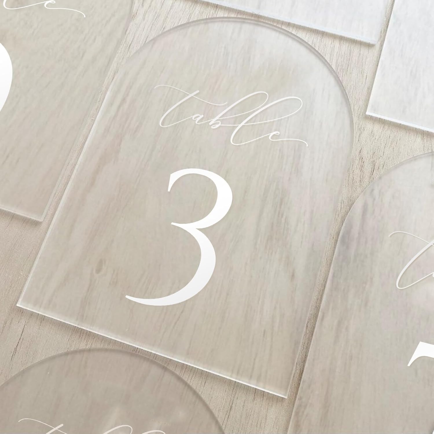 • Frosted Arch Table Numbers with Acrylic Stands: Arched acrylic is so on trend for this year's wedding decorations. These gorgeous arch acrylic wedding table numbers will look stunning on your tables and go with any wedding style, from rustic through to timeless and classic.