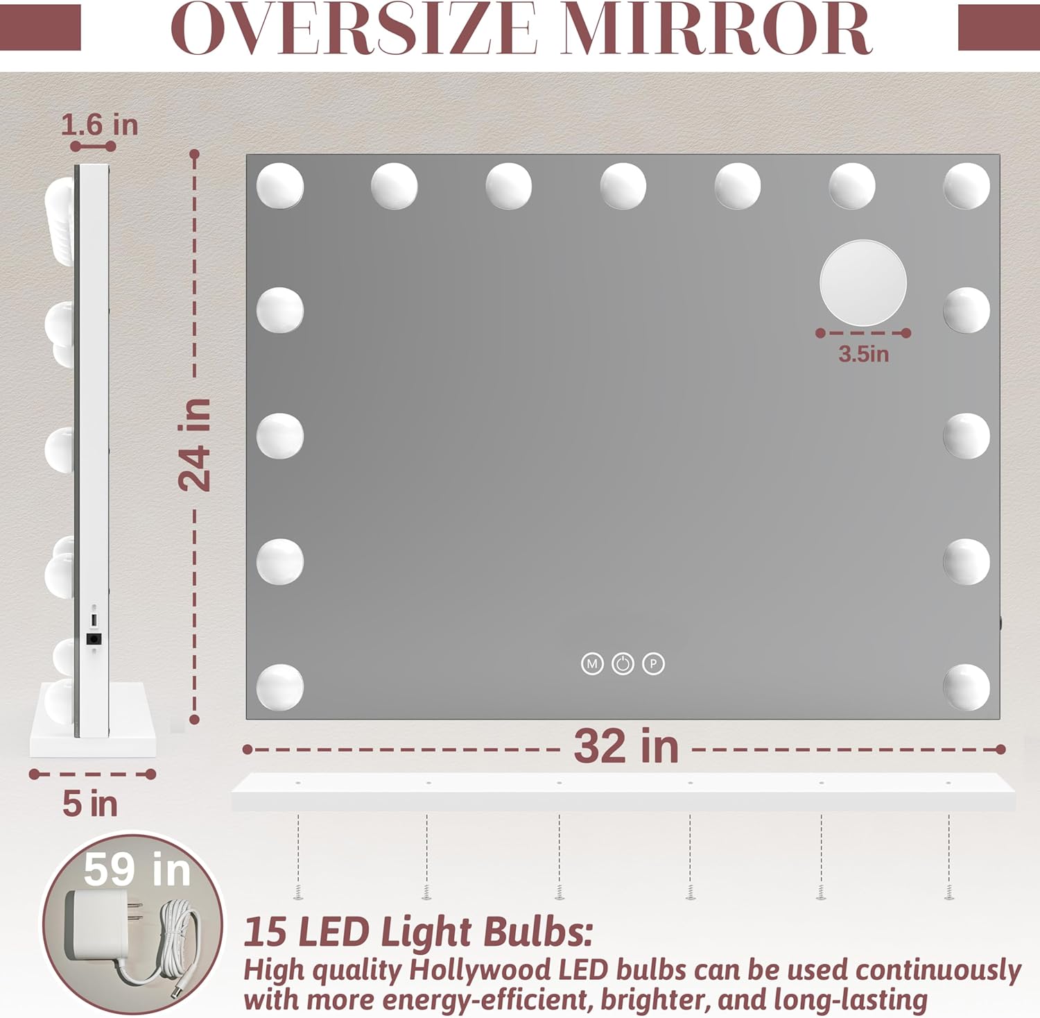 • 【UPGRADED EXTRA LARGE SIZE】 Get ready to elevate your makeup game with our 32" x 24" Hollywood vanity mirror. This large size ensures that you can see every angle with ease. Say goodbye to cramped, uncomfortable spaces and hello to the luxury of having plenty of room to create the perfect look.