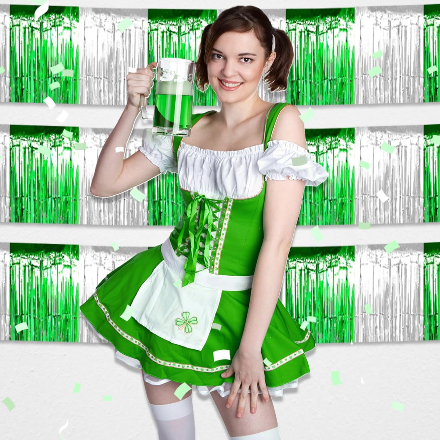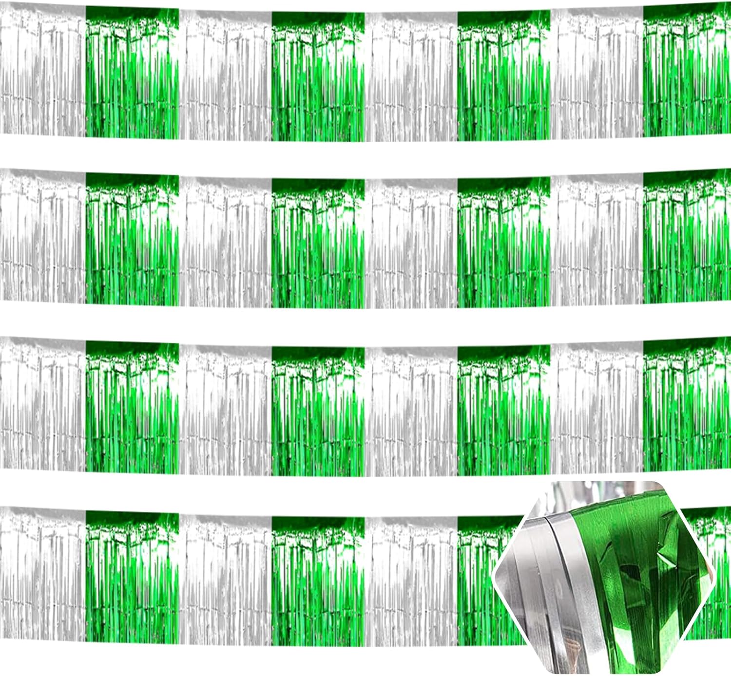 4 Pack 10 Feet Silver Green Foil Fringe Garland Metallic Tinsel Streamers Banner Wall Hanging Curtain Backdrop for Parade Floats, Wedding, Graduate, Mother's Day, Birthday Party Decoration