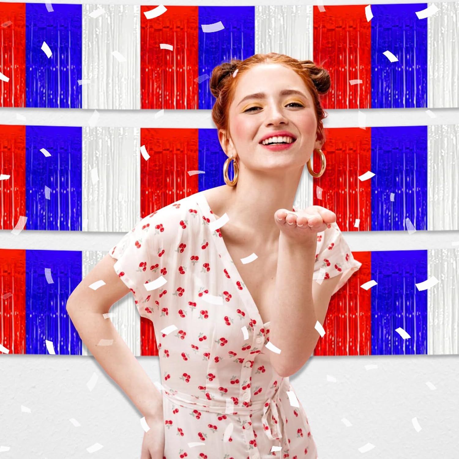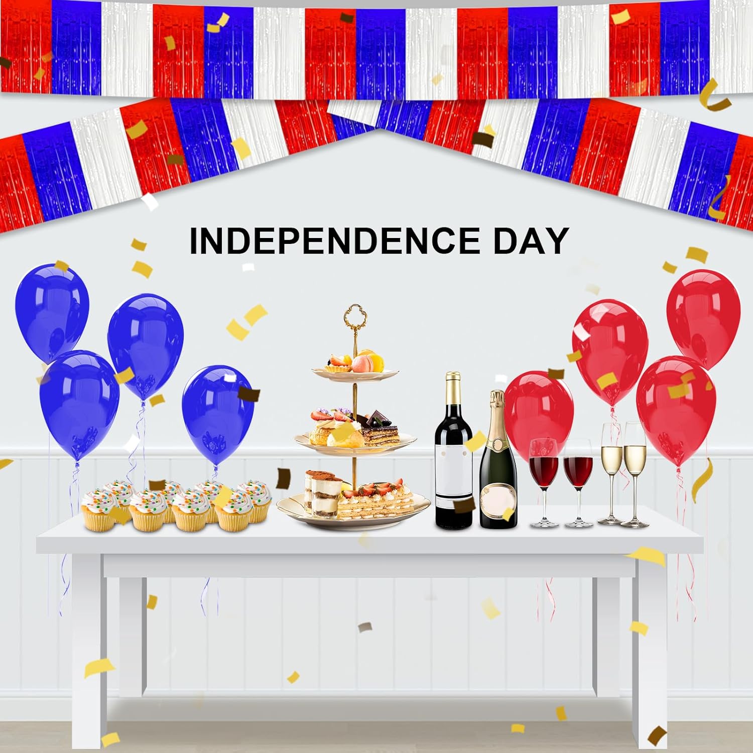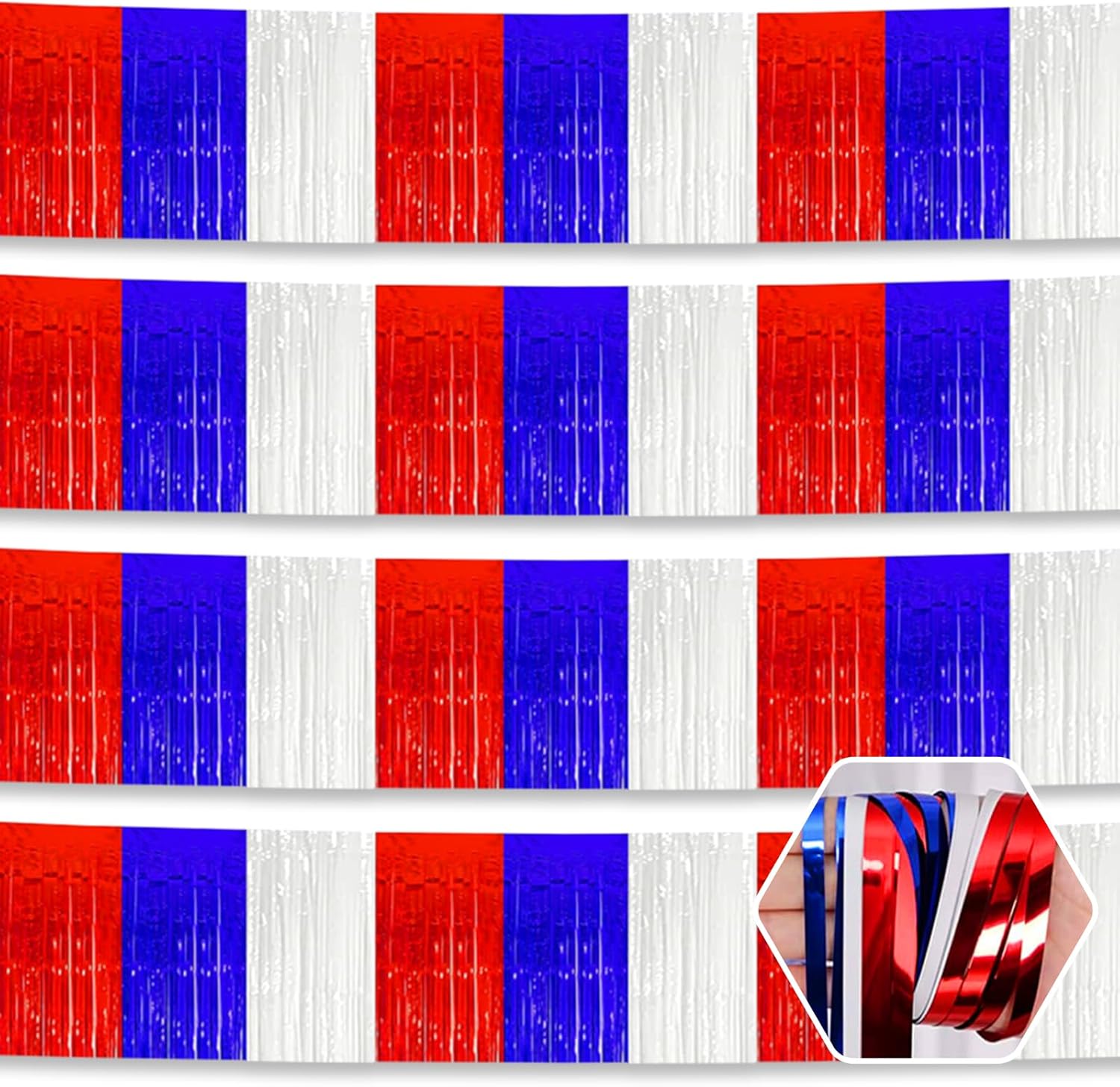 4 Pack 10 Feet White Blue Red Foil Fringe Garland Metallic Tinsel Streamers Banner Wall Hanging Curtain Backdrop for Parade Floats, Wedding, Graduate, Mother's Day, Birthday Party Decoration