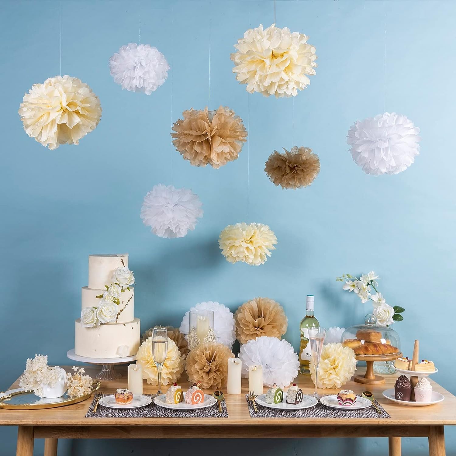 • Perfect for Any Occasion:Whether it's a wedding, birthday, engagement reception, or bridal shower, these pom-poms elevate your decor with understated elegance. Their boho flair suits rustic, vintage, or modern themes, while the gender-neutral tones work for baby showers and boots-or-bows gender reveals. Use them as backdrops, centerpieces, or ceiling accentsβ€”they transform spaces instantly.