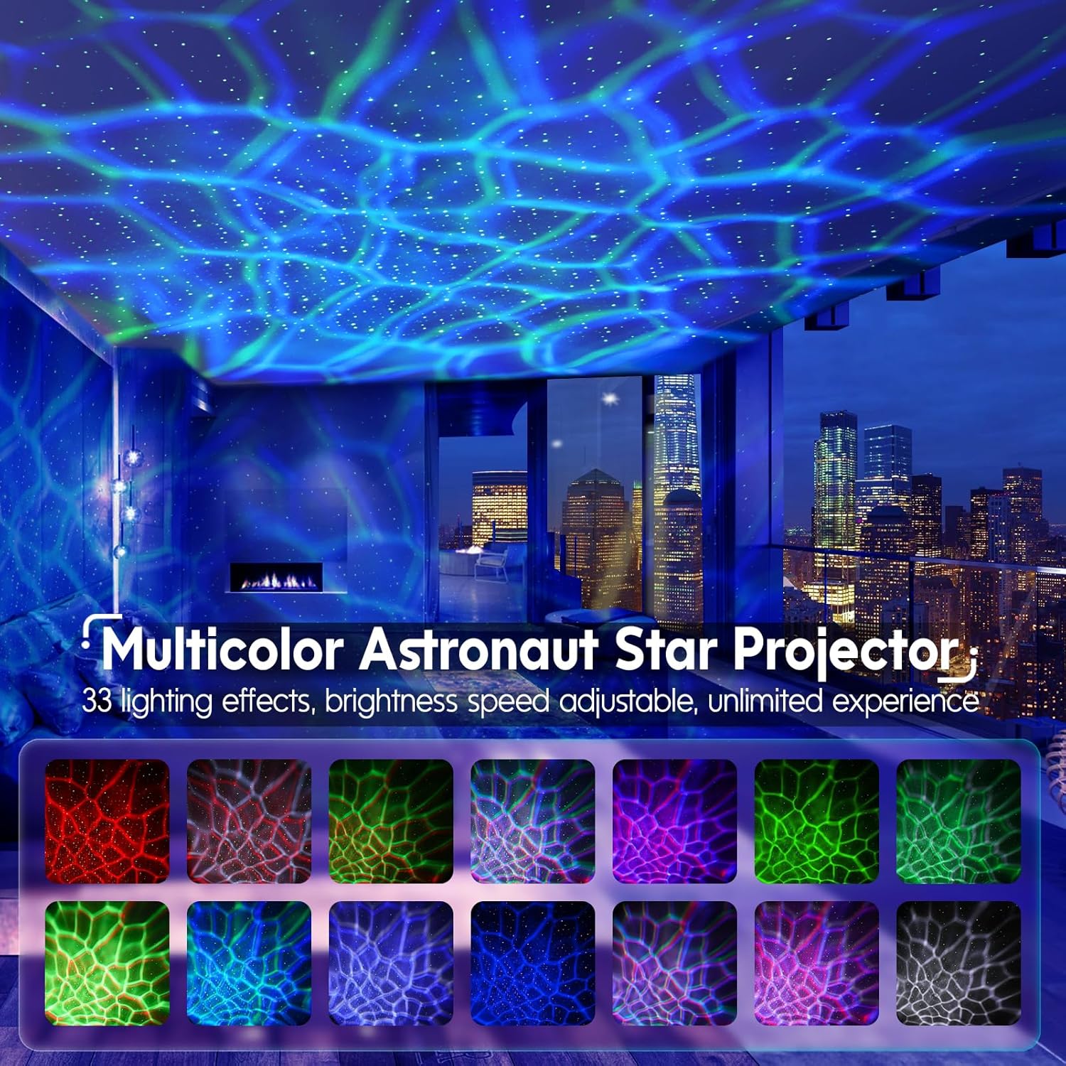 • Upgraded Astronaut Projector Night Light: Rossetta star projector is an exquisite astronaut projector that boasts 33 breathtaking lighting effects combined with twinkling green stars. Whether you choose to project it onto your room's wall or ceiling, it will immerse you in the enchanting beauty of the galaxy, creating a serene and tranquil ambiance. This versatile ambient light enhances movie nights, elevates date nights, and takes your gaming setup to the next level