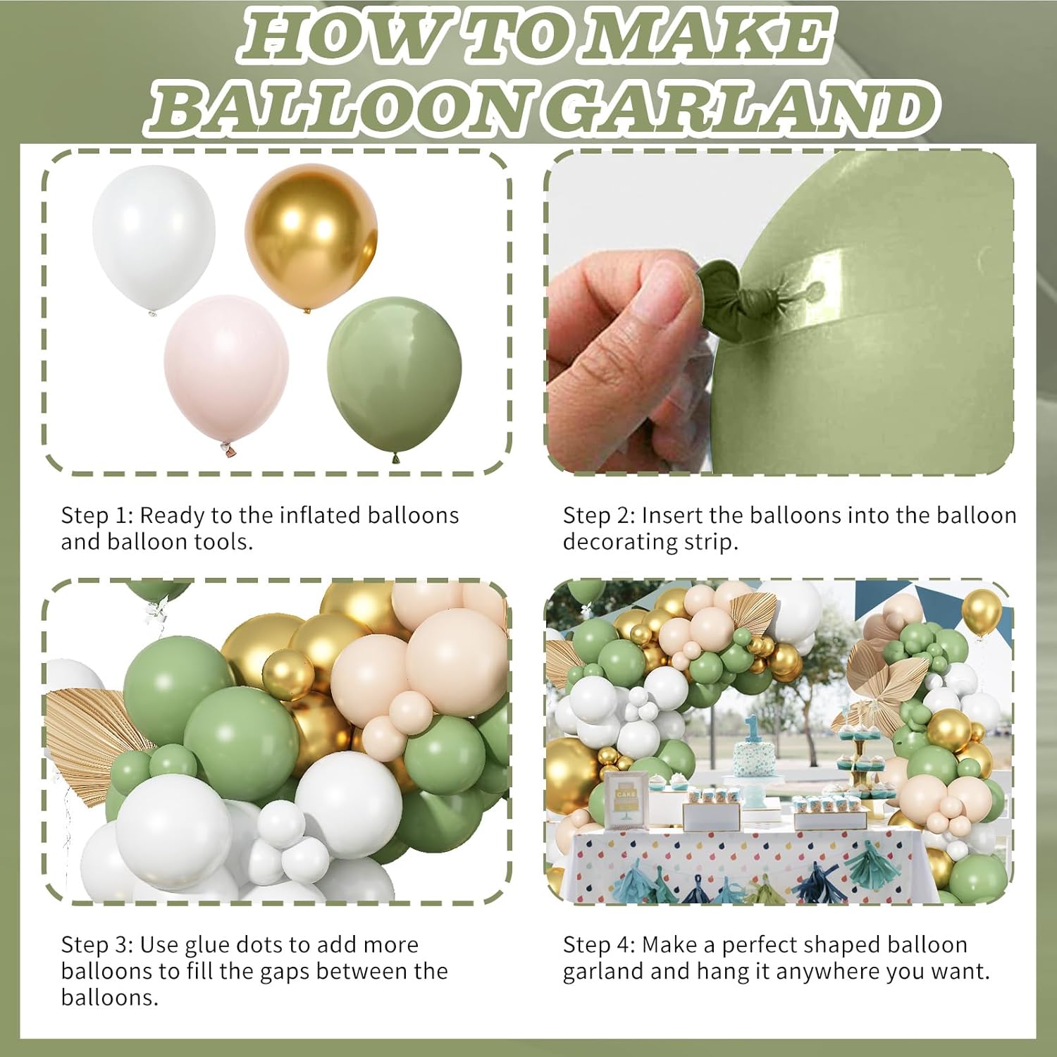 • 🎈What You Get - Sage Green Gold White Balloon Garland Arch Kit, package including 3pcs 18 inches balloons(matte white*1, metallic gold*1, avocado green*1), 47pcs 10 inches balloons(matte white*15, metallic gold*6, avocado green*20, apricot+wihte double stuffed balloons*6), 45pcs 5 inches balloons(matte white*10, metallic gold*15, avocado green*10, apricot+wihte double stuffed balloons*10), 1pc balloon strip, 1pc dot glue. All in one value package!