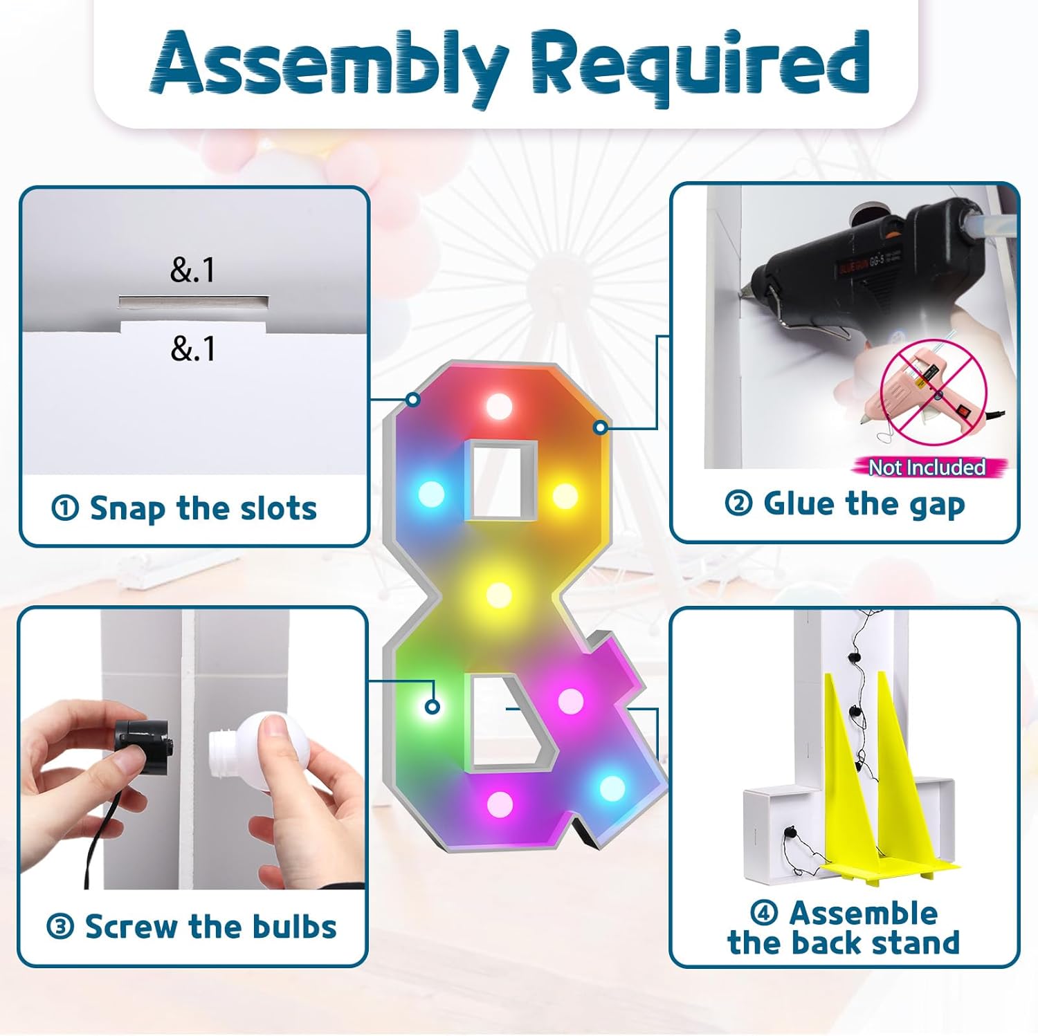 • Assembly Required. To assemble the light up numbers and letters, a hot glue gun is necessary. We have conveniently pre-cut the numbers into several pieces for your convenience. Simply consult the included instruction manual to easily assemble the impressive 4 ft tall and 3ft tall marquee numbers and letters using a hot glue gun.