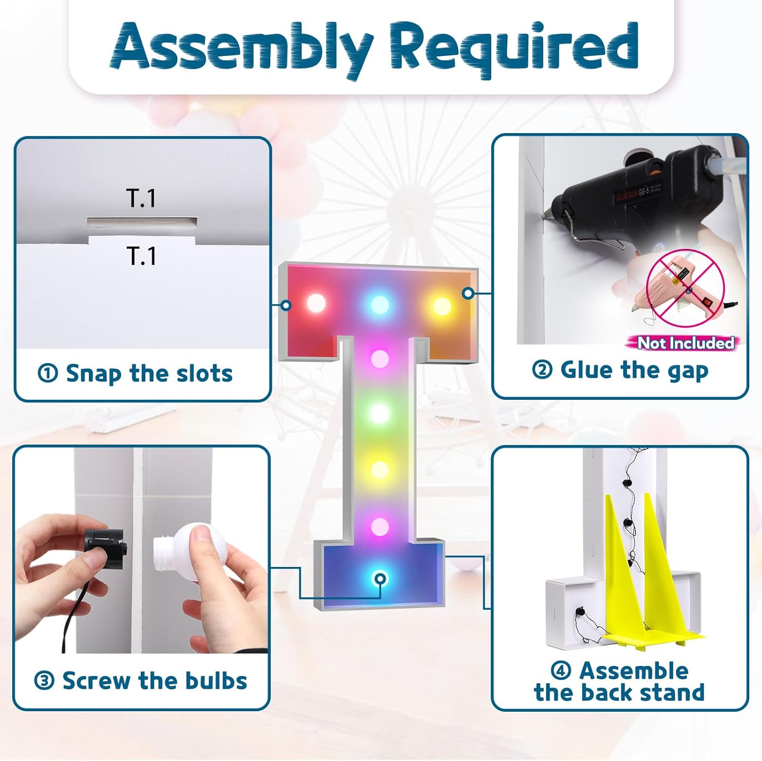 • Assembly Required. To assemble the light up numbers and letters, a hot glue gun is necessary. We have conveniently pre-cut the numbers into several pieces for your convenience. Simply consult the included instruction manual to easily assemble the impressive 4 ft tall and 3ft tall marquee numbers and letters using a hot glue gun.