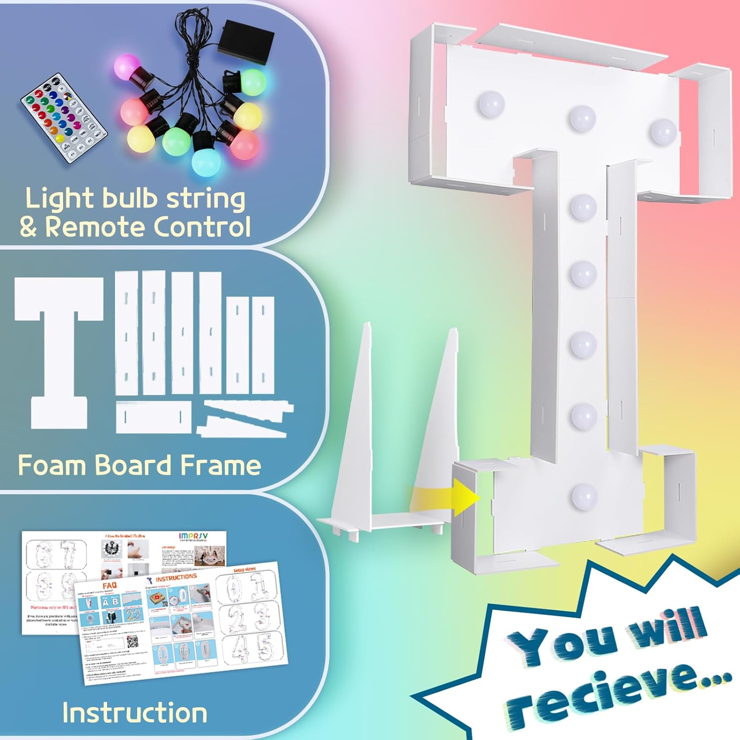 imprsv 3FT Colorful Marquee Light Up Letters T, 18 Colors Large Light up Letters Alphabet Sign with Remote, Big Marry Me Sign, Birthday Party Decorations Baby Shower Anniversary Wedding Decoration
