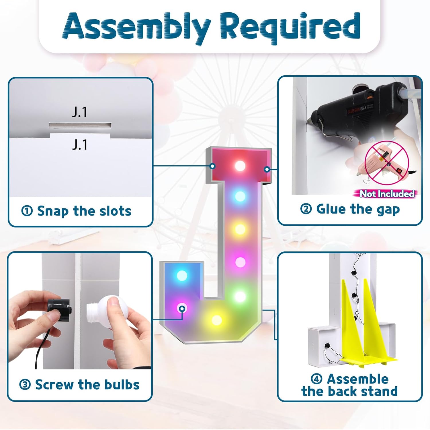 • Assembly Required. To assemble the light up numbers and letters, a hot glue gun is necessary. We have conveniently pre-cut the numbers into several pieces for your convenience. Simply consult the included instruction manual to easily assemble the impressive 4 ft tall and 3ft tall marquee numbers and letters using a hot glue gun.
