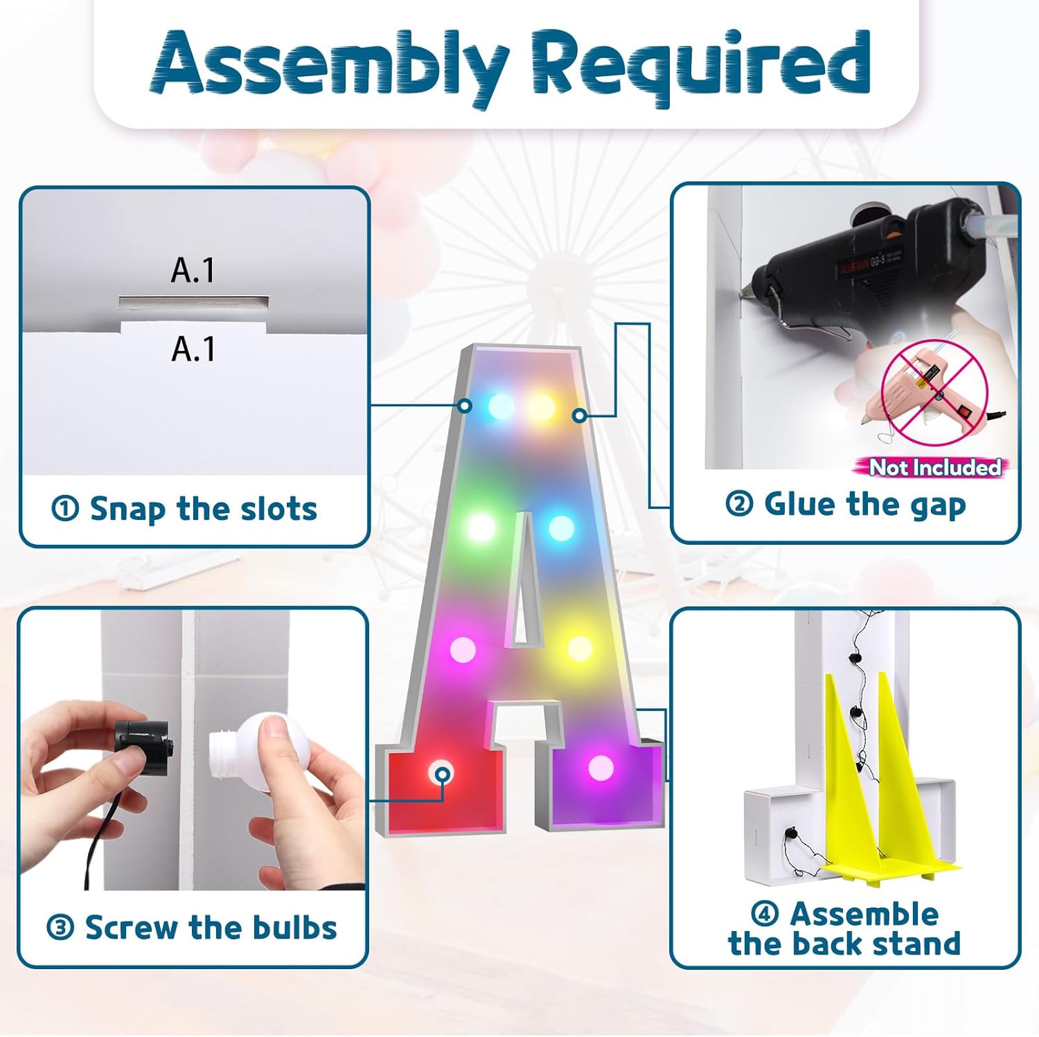 • Assembly Required. To assemble the light up numbers and letters, a hot glue gun is necessary. We have conveniently pre-cut the numbers into several pieces for your convenience. Simply consult the included instruction manual to easily assemble the impressive 4 ft tall and 3ft tall marquee numbers and letters using a hot glue gun.