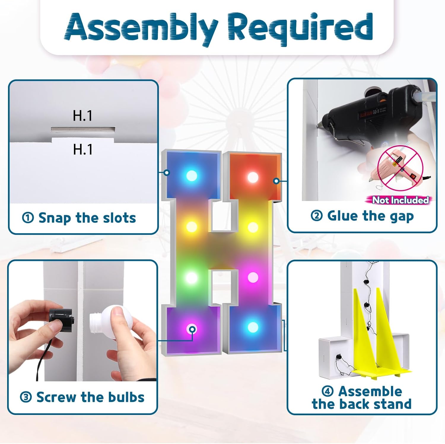 • Assembly Required. To assemble the light up numbers and letters, a hot glue gun is necessary. We have conveniently pre-cut the numbers into several pieces for your convenience. Simply consult the included instruction manual to easily assemble the impressive 4 ft tall and 3ft tall marquee numbers and letters using a hot glue gun.