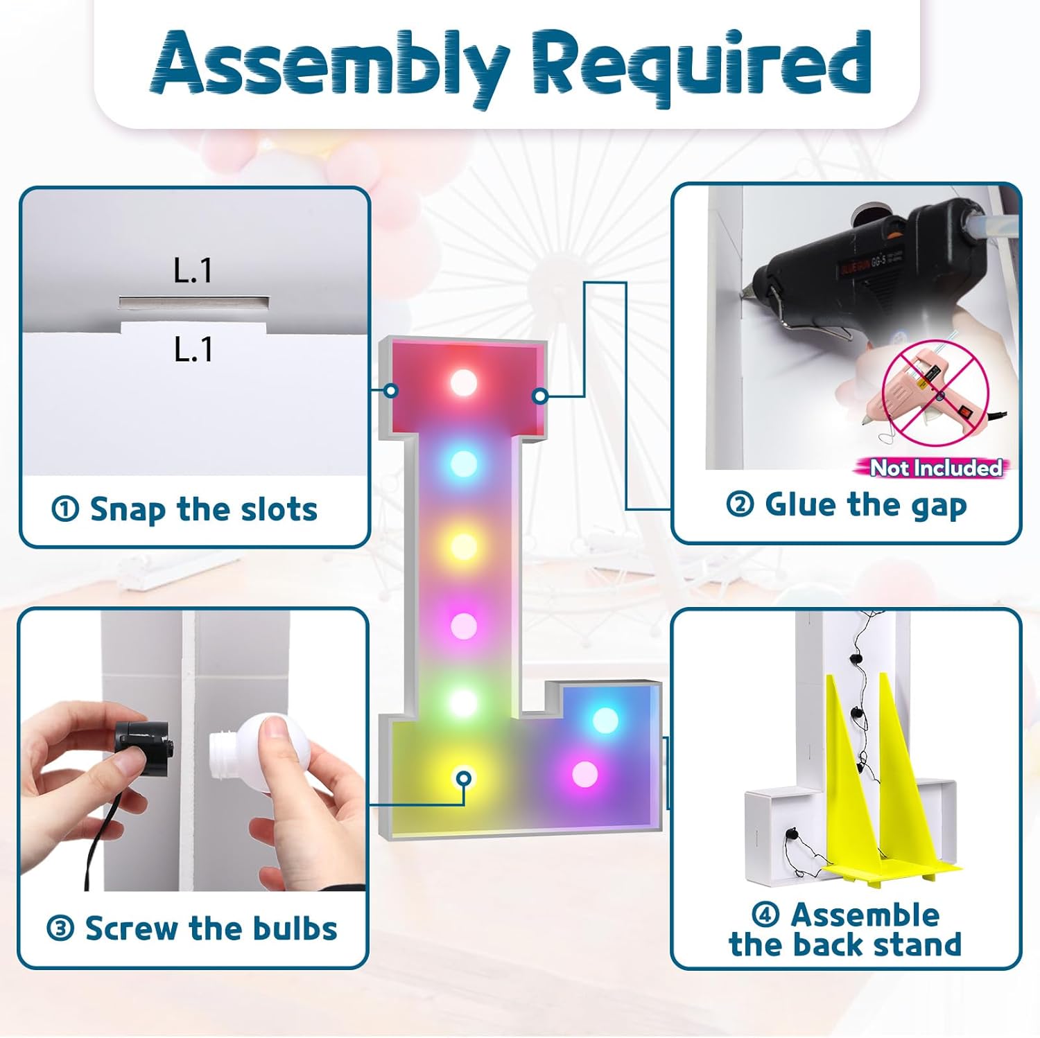 • Assembly Required. To assemble the light up numbers and letters, a hot glue gun is necessary. We have conveniently pre-cut the numbers into several pieces for your convenience. Simply consult the included instruction manual to easily assemble the impressive 4 ft tall and 3ft tall marquee numbers and letters using a hot glue gun.