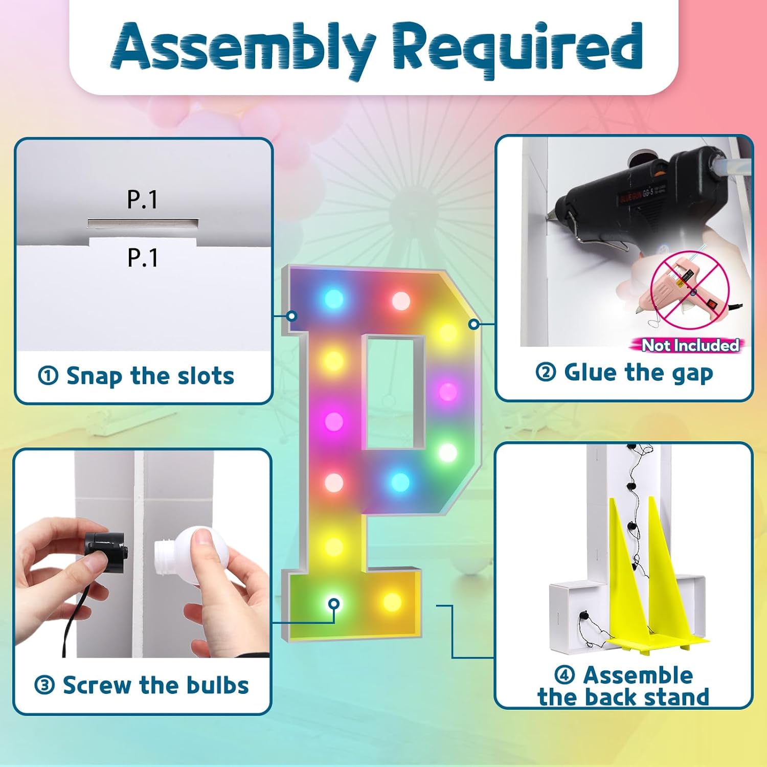 • Assembly Required. To assemble the light up numbers and letters, a hot glue gun is necessary. We have conveniently pre-cut the numbers into several pieces for your convenience. Simply consult the included instruction manual to easily assemble the impressive 4 ft tall and 3ft tall marquee numbers and letters using a hot glue gun.