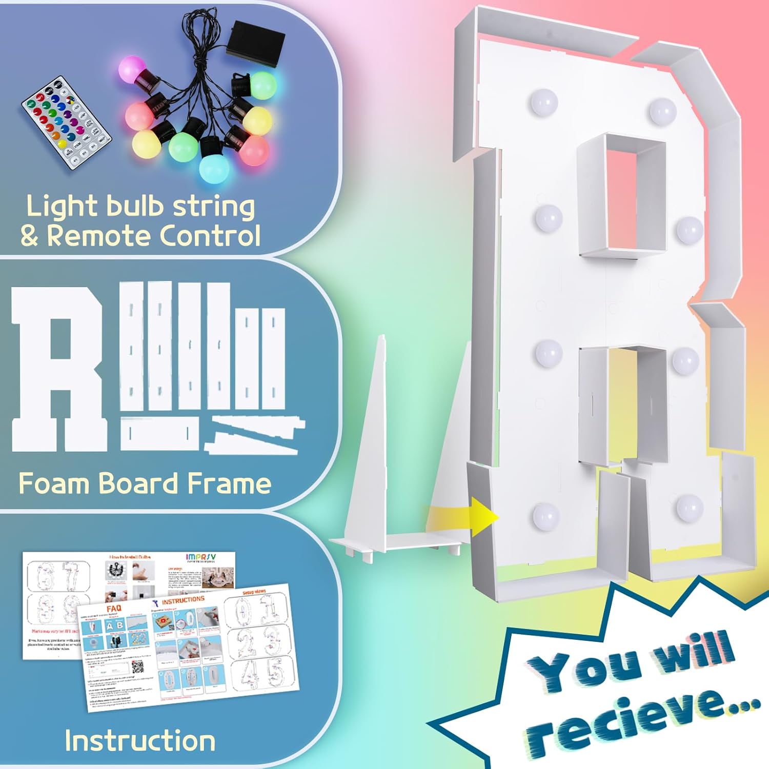 imprsv 3FT Colorful Marquee Light Up Letters R, 18 Colors Light Up Letters Alphabet Sign with Remote, Marry Me Light Up Letters, Large Letters for Birthday Engagement Anniversary Wedding Party Decor