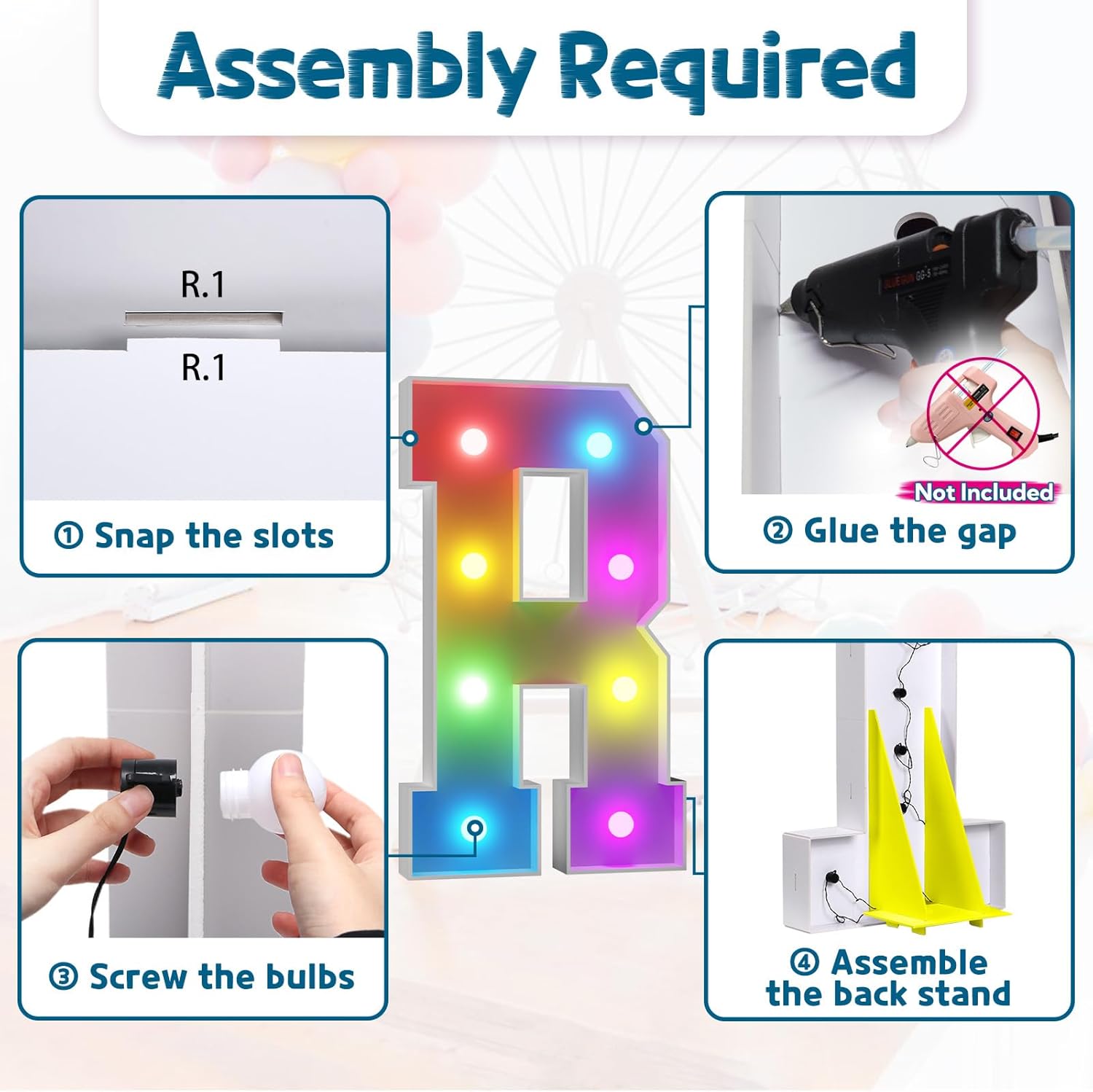 • Assembly Required. To assemble the light up numbers and letters, a hot glue gun is necessary. We have conveniently pre-cut the numbers into several pieces for your convenience. Simply consult the included instruction manual to easily assemble the impressive 4 ft tall and 3ft tall marquee numbers and letters using a hot glue gun.