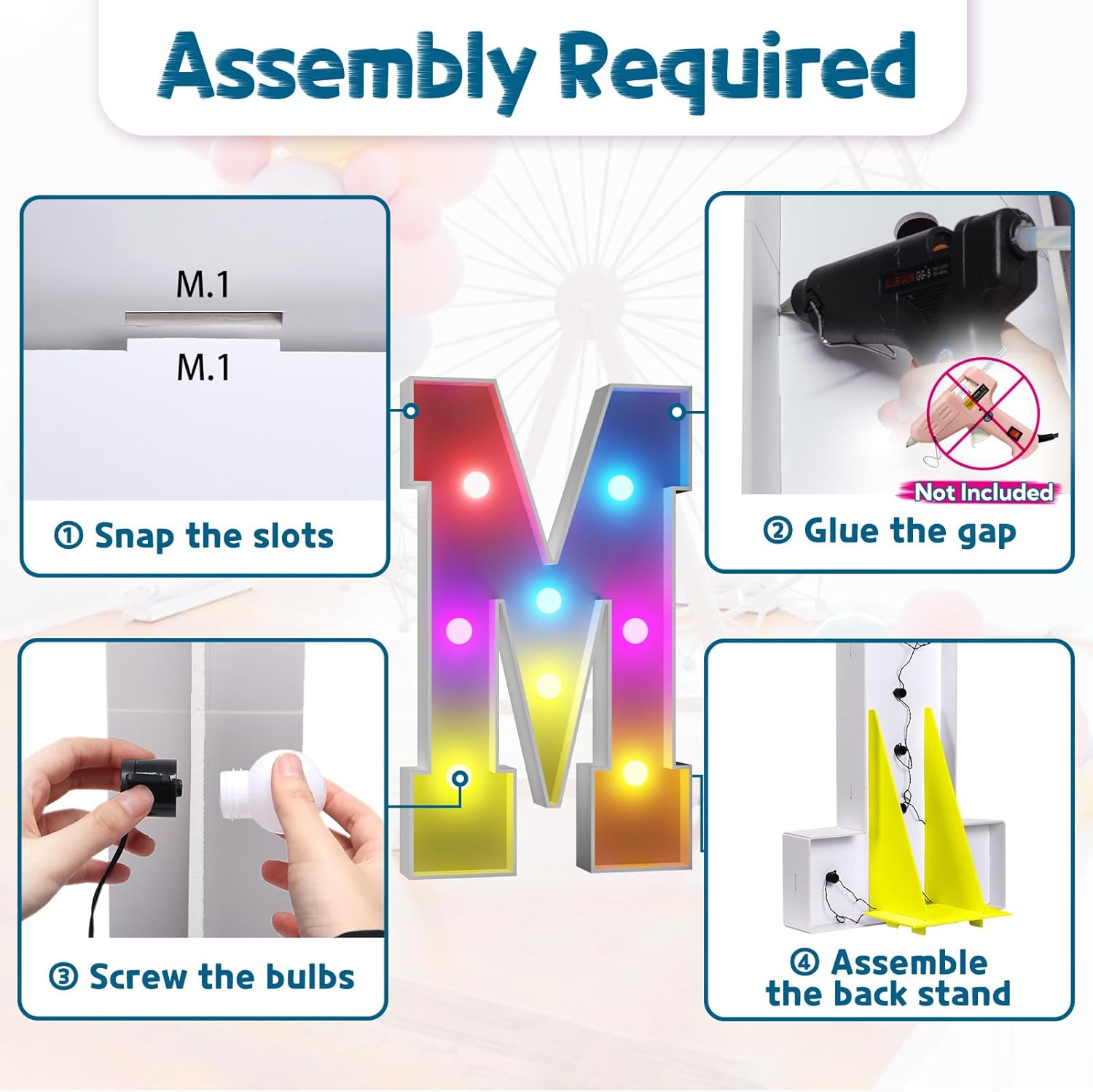 • Assembly Required. To assemble the light up numbers and letters, a hot glue gun is necessary. We have conveniently pre-cut the numbers into several pieces for your convenience. Simply consult the included instruction manual to easily assemble the impressive 4 ft tall and 3ft tall marquee numbers and letters using a hot glue gun.