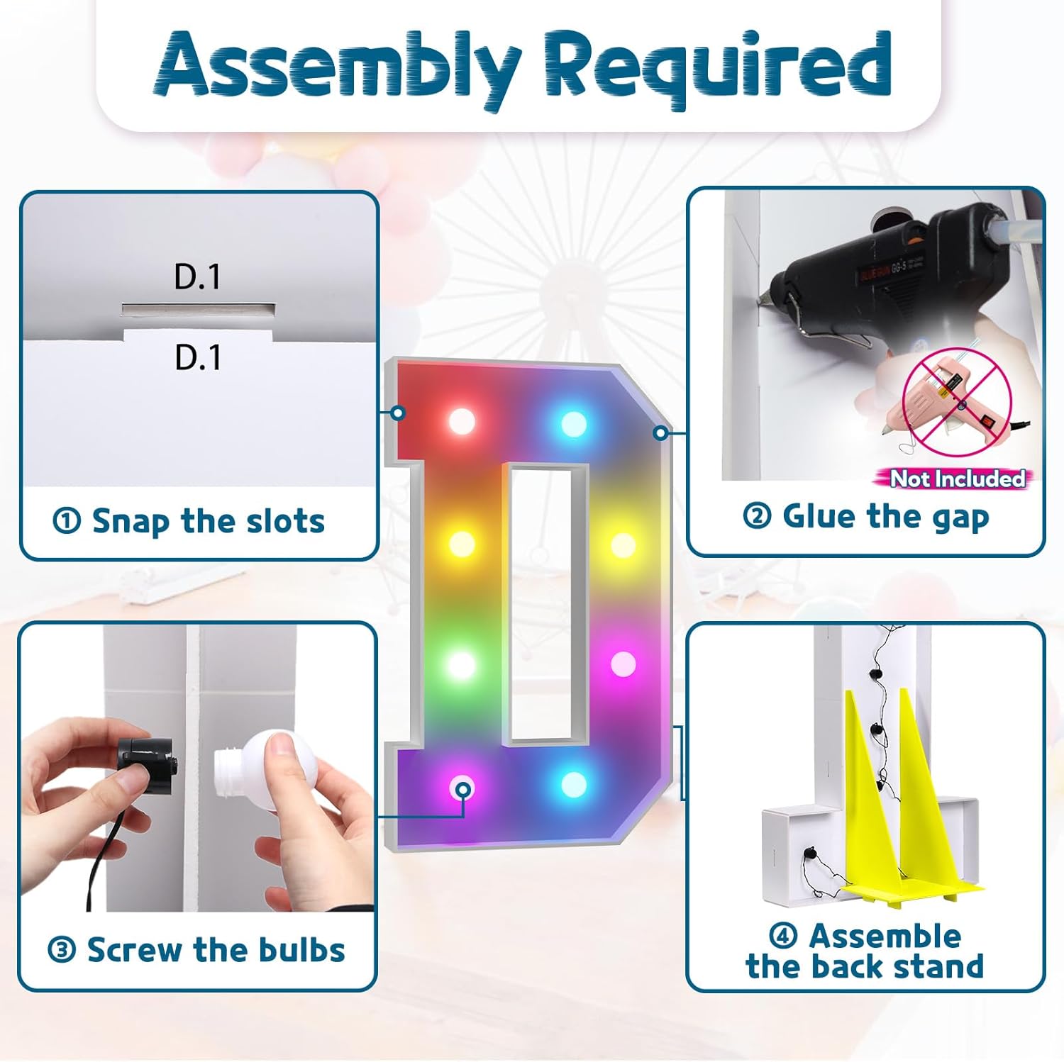 • Assembly Required. To assemble the light up numbers and letters, a hot glue gun is necessary. We have conveniently pre-cut the numbers into several pieces for your convenience. Simply consult the included instruction manual to easily assemble the impressive 4 ft tall and 3ft tall marquee numbers and letters using a hot glue gun.