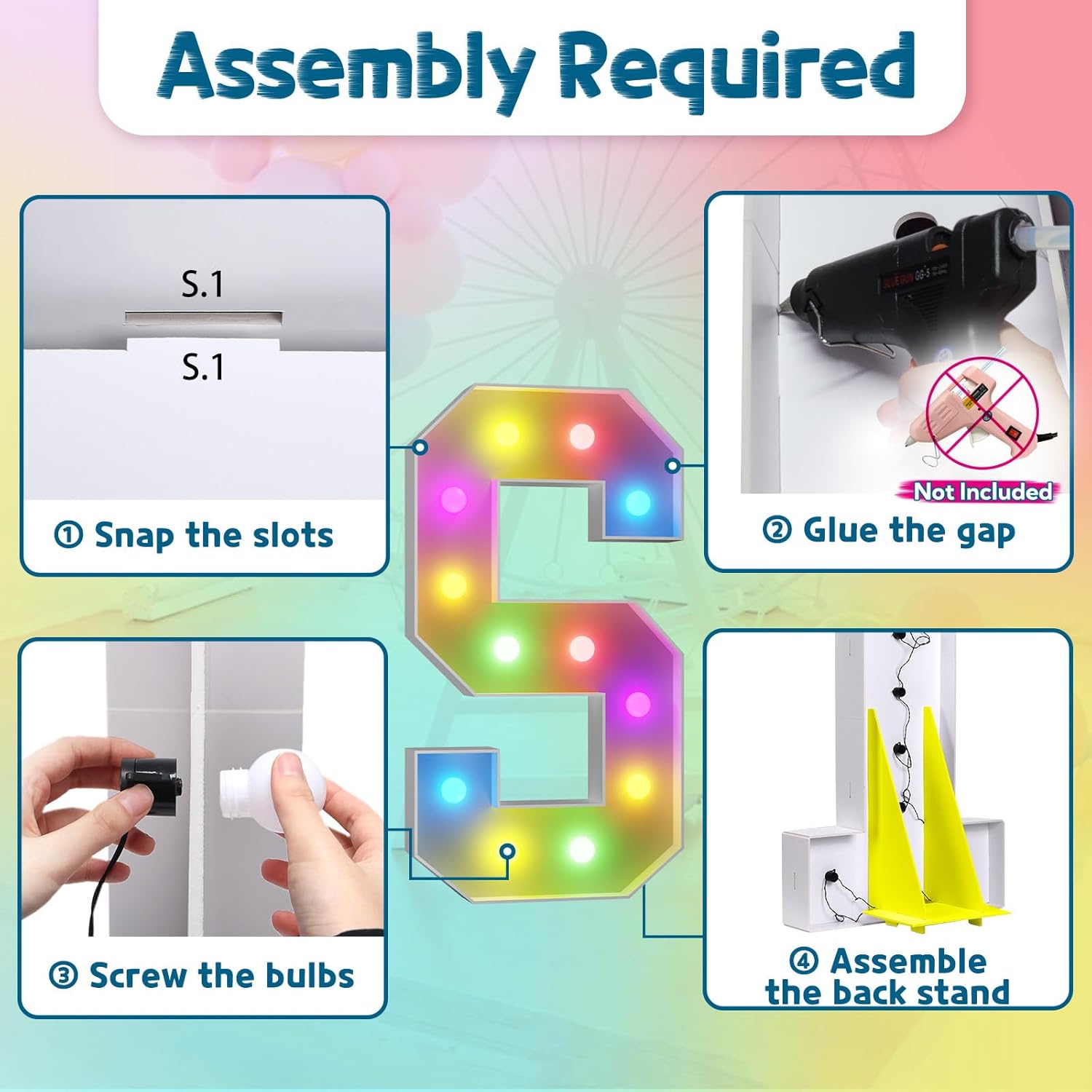 • Assembly Required. To assemble the light up numbers and letters, a hot glue gun is necessary. We have conveniently pre-cut the numbers into several pieces for your convenience. Simply consult the included instruction manual to easily assemble the impressive 4 ft tall and 3ft tall marquee numbers and letters using a hot glue gun.