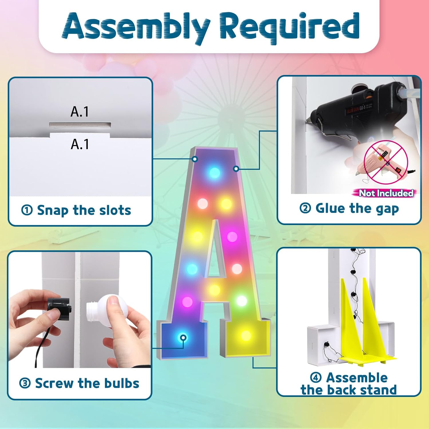 • Assembly Required. To assemble the light up numbers and letters, a hot glue gun is necessary. We have conveniently pre-cut the numbers into several pieces for your convenience. Simply consult the included instruction manual to easily assemble the impressive 4 ft tall and 3ft tall marquee numbers and letters using a hot glue gun.