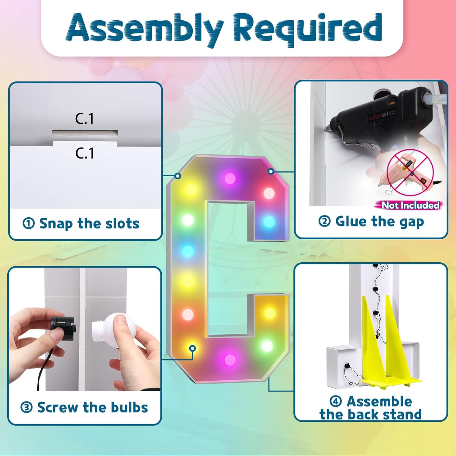 • Assembly Required. To assemble the light up numbers and letters, a hot glue gun is necessary. We have conveniently pre-cut the numbers into several pieces for your convenience. Simply consult the included instruction manual to easily assemble the impressive 4 ft tall and 3ft tall marquee numbers and letters using a hot glue gun.