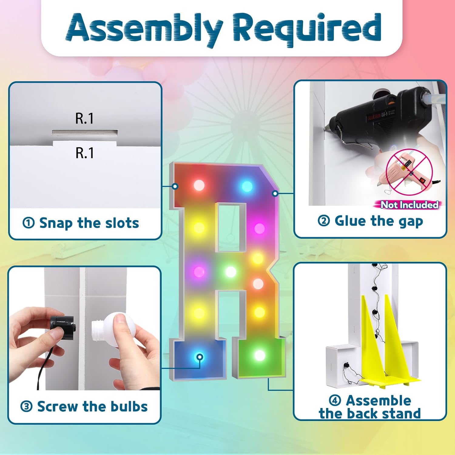 • Assembly Required. To assemble the light up numbers and letters, a hot glue gun is necessary. We have conveniently pre-cut the numbers into several pieces for your convenience. Simply consult the included instruction manual to easily assemble the impressive 4 ft tall and 3ft tall marquee numbers and letters using a hot glue gun.