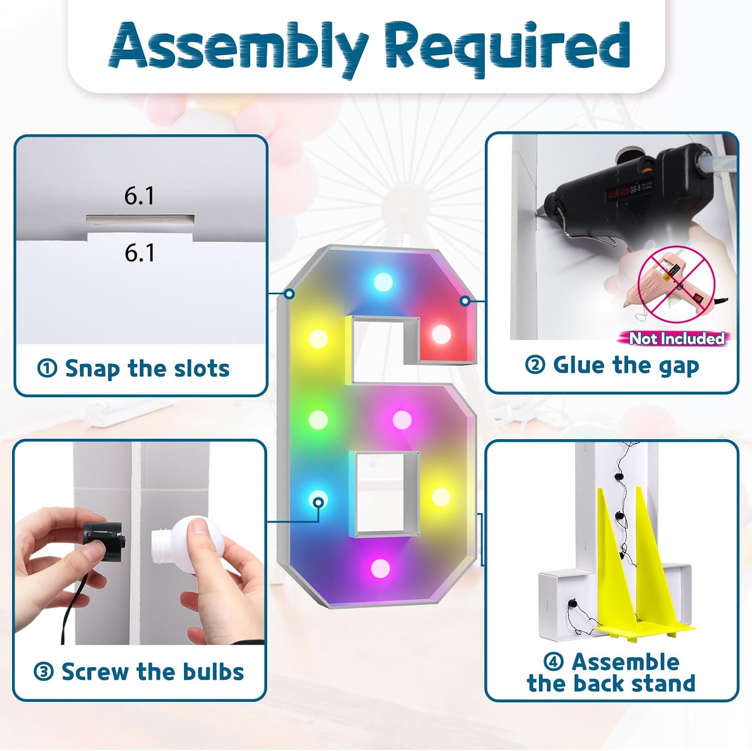 • Assembly Required. To assemble the light up numbers and letters, a hot glue gun is necessary. We have conveniently pre-cut the numbers into several pieces for your convenience. Simply consult the included instruction manual to easily assemble the impressive 4 ft tall and 3ft tall marquee numbers and letters using a hot glue gun.