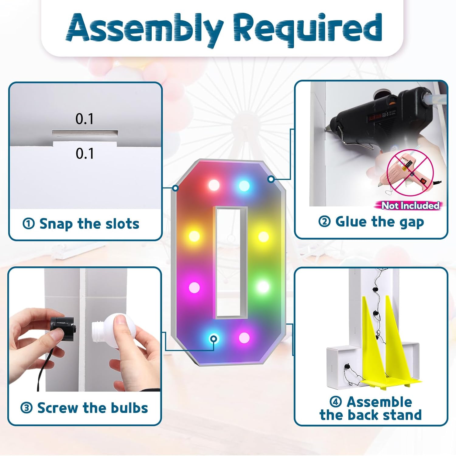 • Assembly Required. To assemble the light up numbers and letters, a hot glue gun is necessary. We have conveniently pre-cut the numbers into several pieces for your convenience. Simply consult the included instruction manual to easily assemble the impressive 4 ft tall and 3ft tall marquee numbers and letters using a hot glue gun.