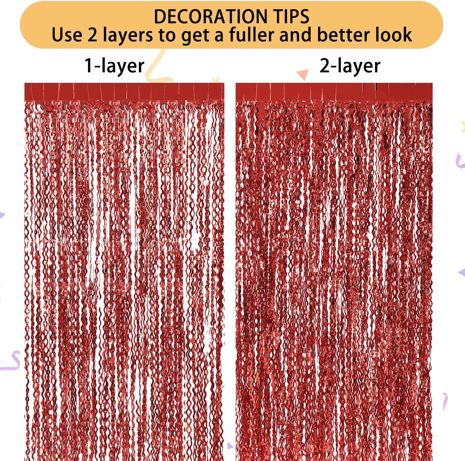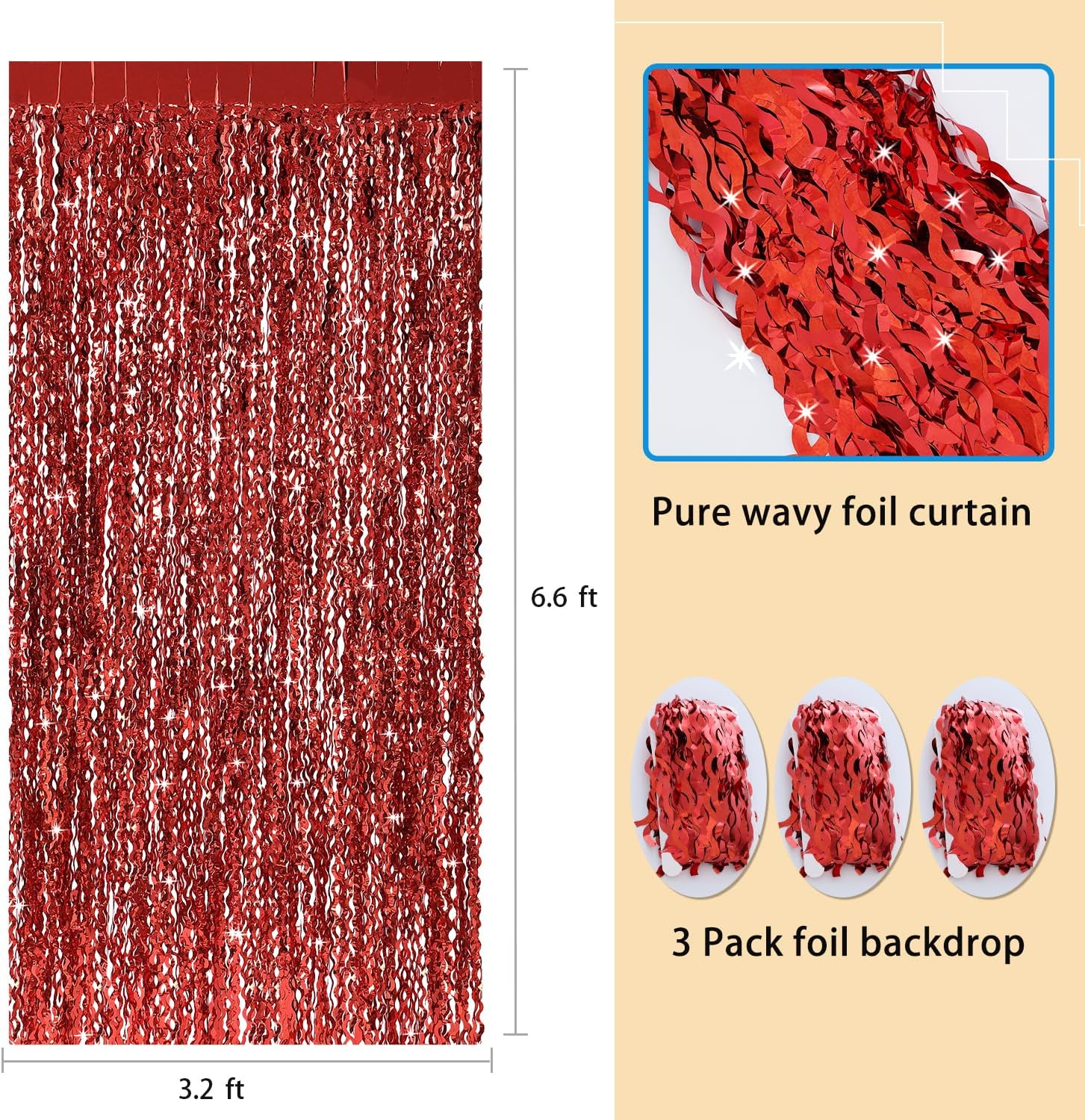 3 Pack Red Aluminium Foil Curtains, 3.3ft x 6.6ft, Wavy Shape, for Party Decorations & Photo Background