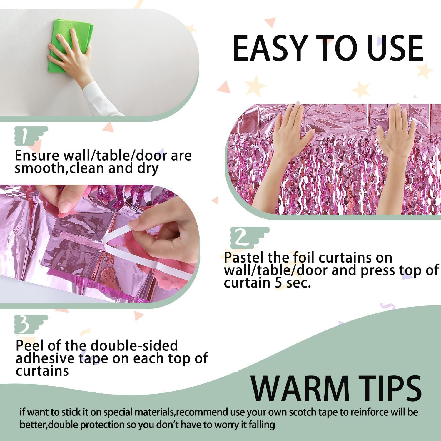 • Easy to Assemble: The back of the pink tinsel backdrop has double-sided tape, which can be stuck very firmly to any place you want such as walls, tables, door frames. You can use scissors to cut the length you want, and you can use two or more pieces of the curtain to splice and overlap to achieve unexpected effects!