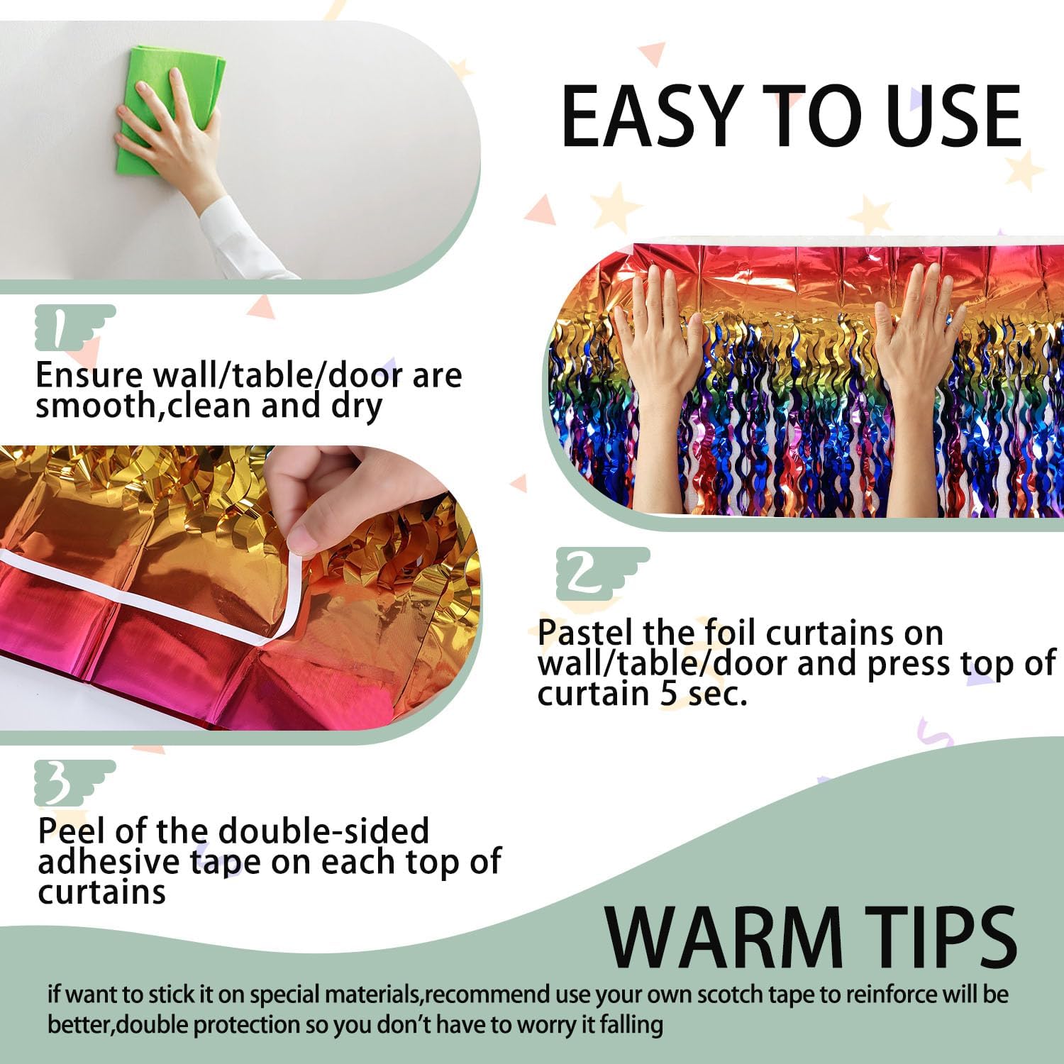 • Package Included: 3 packs rainbow fringe backdrop, the size of 3.3*6.6ft,It's long enough to fit any occasion,Please do not stick the foil curtain on uneven or stained walls to prevent it from falling off!!!