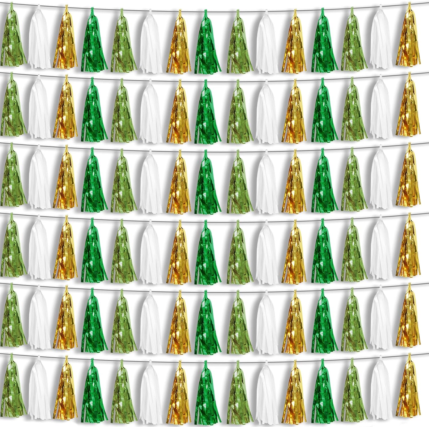 • 【Light Green White Gold Green Party Supplies Set】: The total length of the Light Green White Gold Green birthday tassels banner is 59 feet, divided into 6 strips, each 9.8 feet long. Each banner contains 15 tassels, and each tassel measures 14 inches, for birthday decorations many occasions, and so on