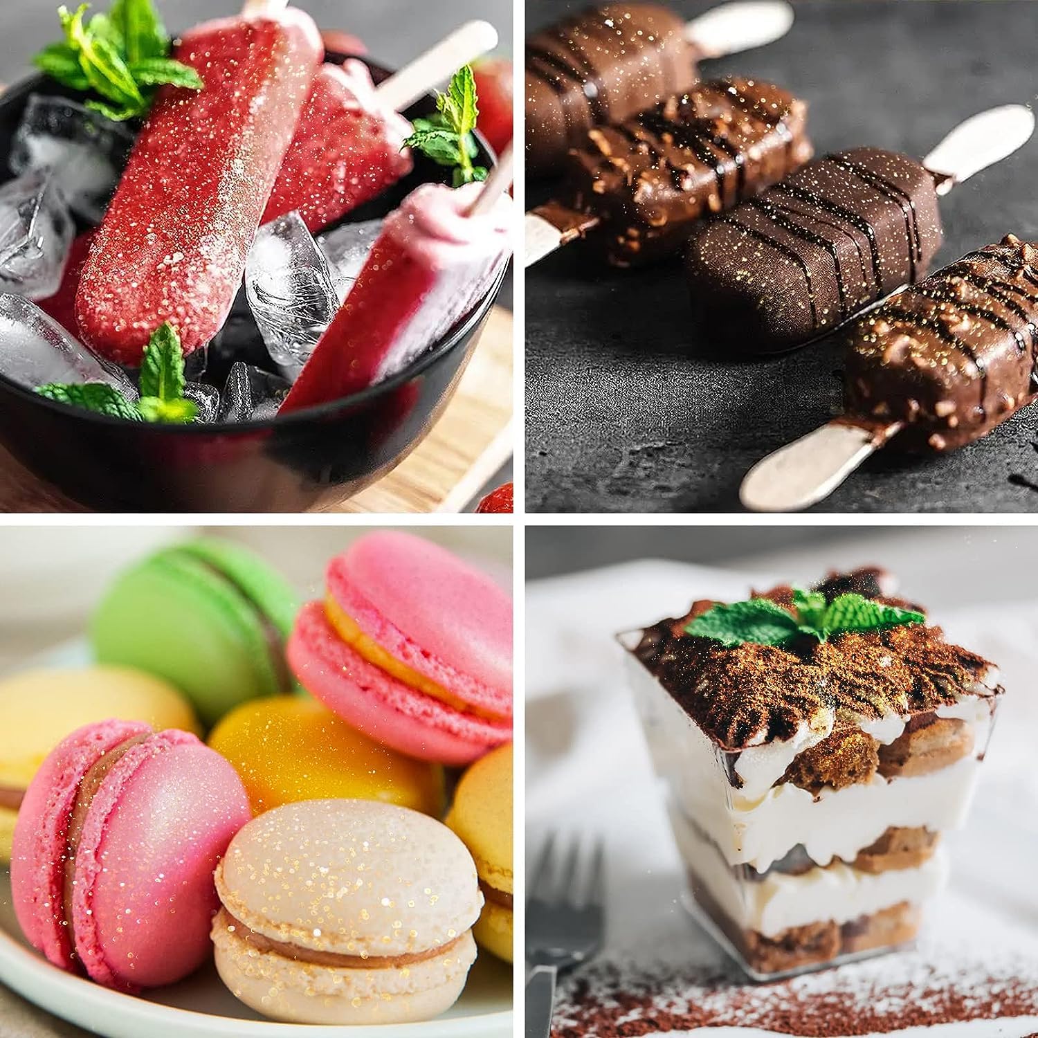 • 🍫【SAFE EDIBLE】This drink glitter edible dust is made with safe ingredients, 100% edible. The main ingredient is mica powder, which is a food grade edible ingredient, titanium dioxide and iron oxide are all state certified safe food grade additives. Luster dust edible has no smell or taste, so you don't have to worry about it affecting the flavour of your food or drink. Note: Please store glitter in a cool, dry place after use and do not expose the shimmering slitter to high temperatures.