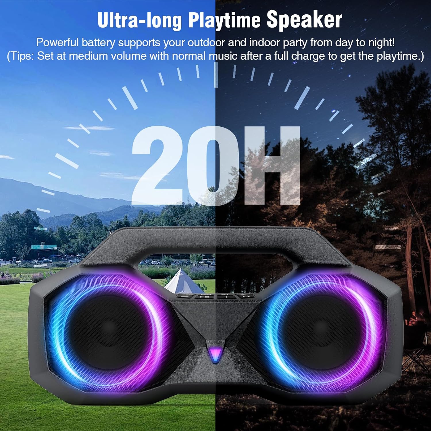 • 7-Mode Switchable Light Shows - The loud speaker features 7 unique dynamic LED lighting modes that sync rhythmically to your music's beat. Pulsating patterns and soothing gradients match your mood. From a relaxed chill-out session to an energetic dance party.
