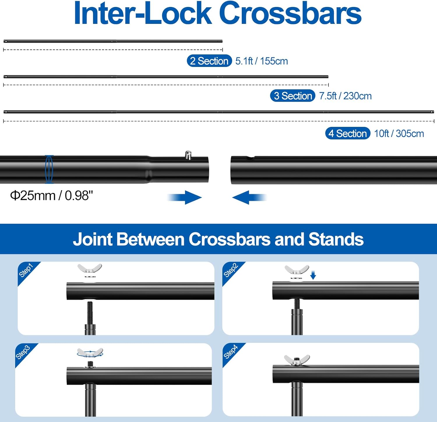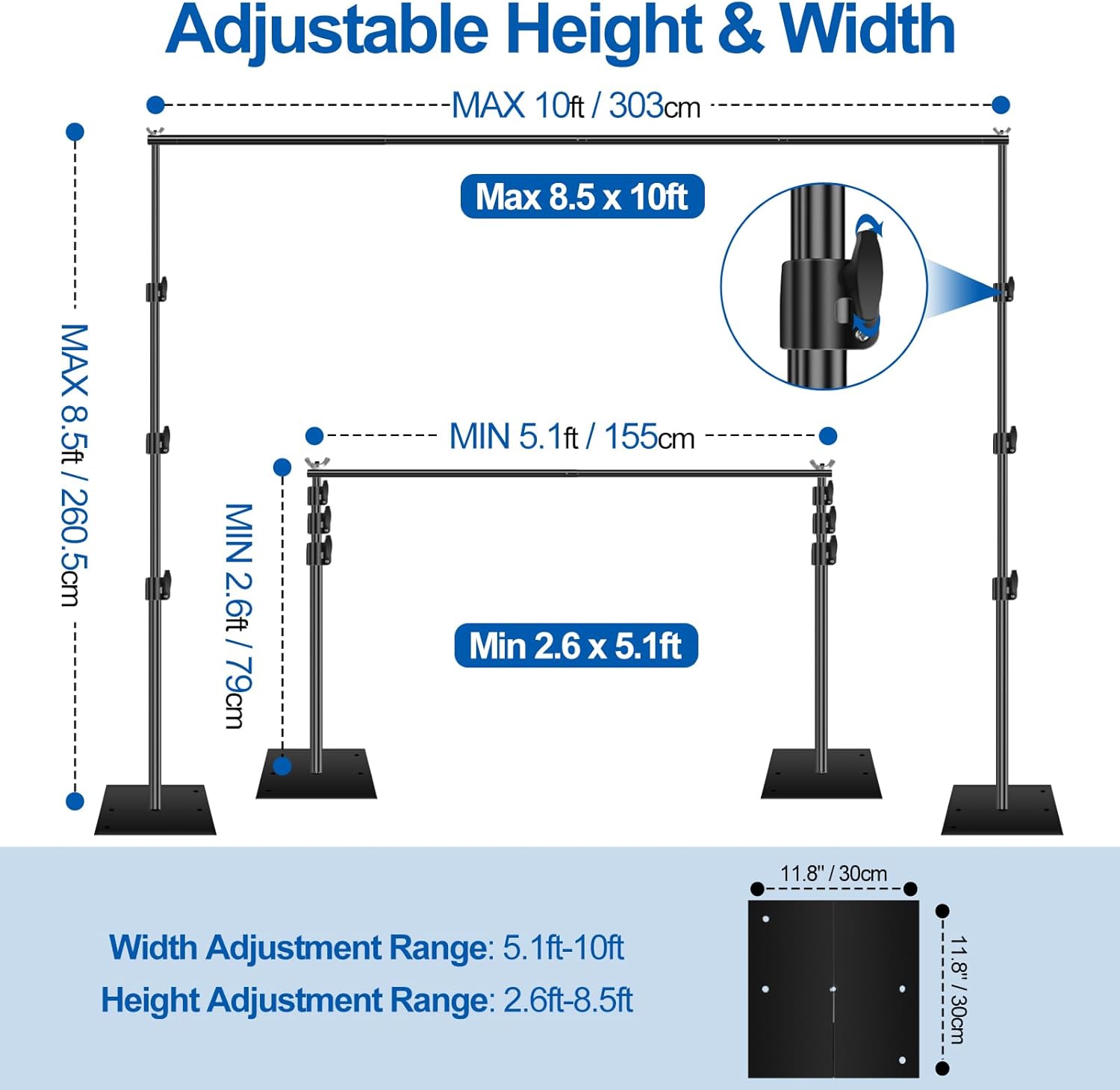 • 【Adjustable Height & Width】Backdrop stand adopts aluminum alloy construction, long-lasting and sturdy. Height and width adjustable with good flexibility, height can be adjusted from 2.6ft-8.5ft, telescopic crossbars width can be adjusted from 5.2ft to 10ft. Loading capacity up to 28lb. Easy to assemble and disassemble in just a few minutes.