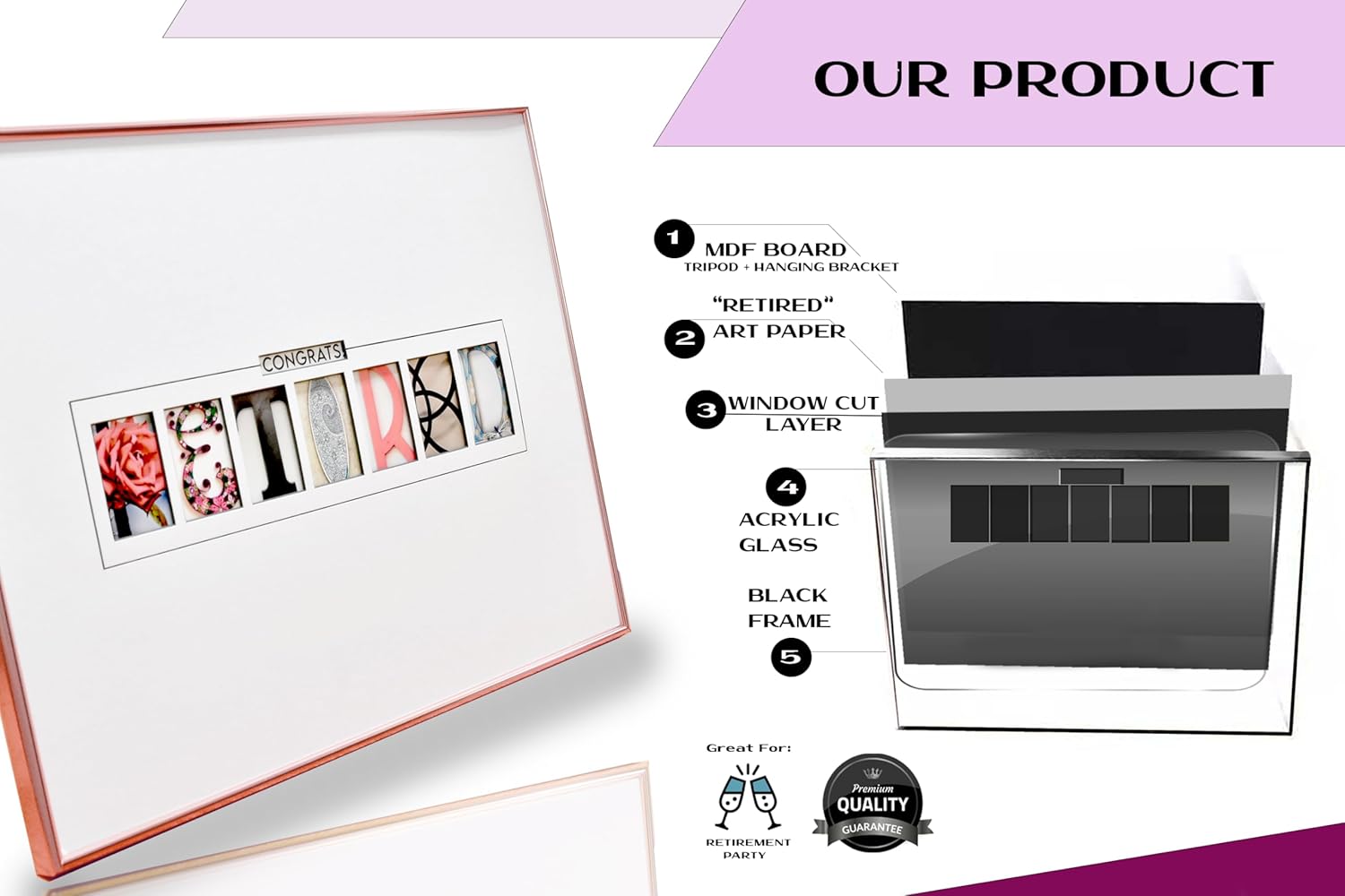 • Perfect for Any Room: The framed rose gold retirement card can be displayed in any room of the retiree's home or office as cherished reminders of their hard work and accomplishments.